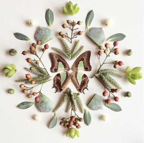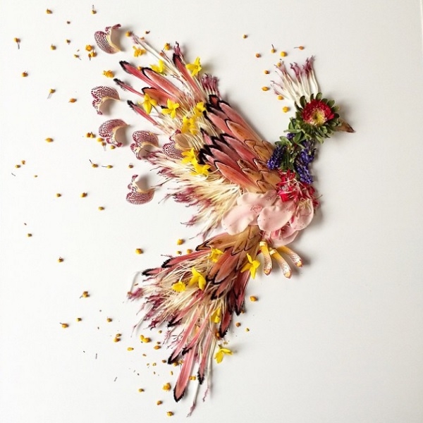 Collins, çiçekler, tohumlar, yapraklar hatta meyveleri bir araya getirerek geometrik desenler, ilginç mizansenler ve hayvanlar yaratmış. Doğanın kendi dokularını ve renklerini kullanıp, içine hayal gücünü de katmış. Ortaya çıkan eserler, hikayeleri ve mizansenleri ile doğaya hak ettiği değeri verir nitelikte.
