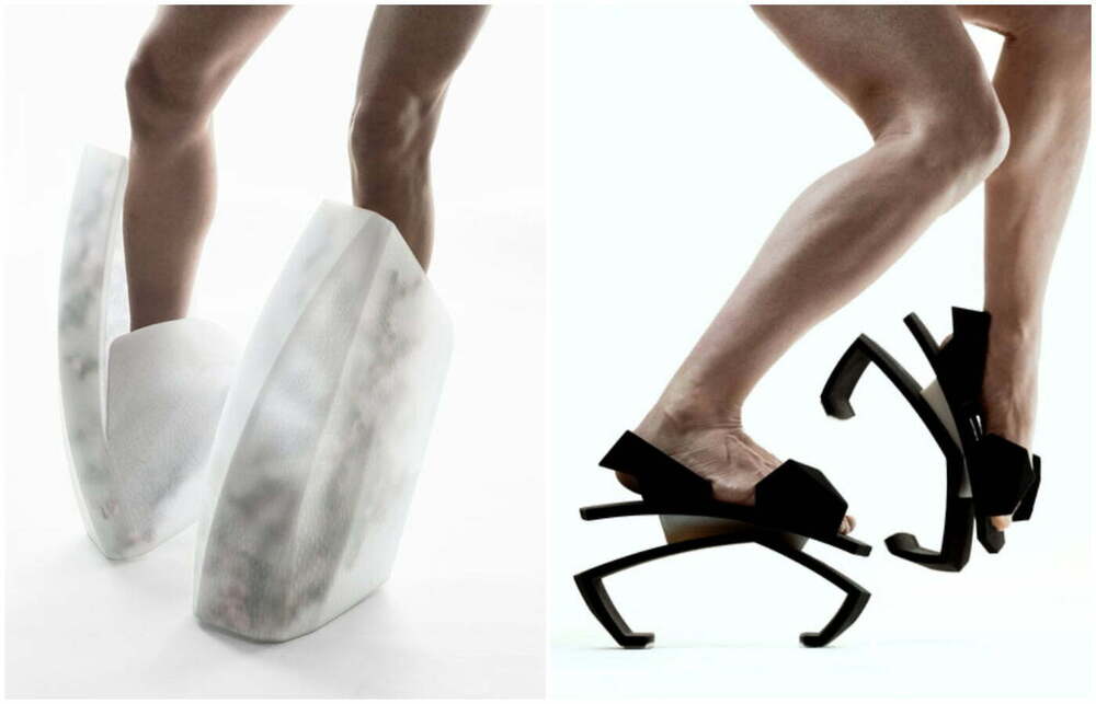 Venice Heel (Venedik Topuğu) adı verilen ilk ayakkabı tahmin edileceği üzere sel bölgelerinde rahatça yürümek için tasarlanmış yüksekliğiyle dikkat çeken bir ayakkabı. Yeşim ve turkuaz mermer maddelerinin soluk renkleriyle birleşen devasa topuklar kullanıcıların kentsel alanlardaki ani su baskınlarında yürümesi için tasarlanmış. “Hi Tide” ve “Lo Tide” olarak iki farklı modeli bulunan tasarımların birinde ayak bilekleri ve parmaklar açıktayken diğerinde daha kaba ve yüksek bir tasarım dikkat çekiyor.