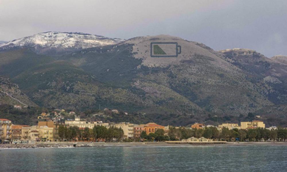 Sanatçının bir tür ekolojik sanat müdahalesi niteliğindeki projesi, dağın çıplak yüzünde bulunan pil şeklinde bir görselle temsil ediliyor. Boş pil görselinin şu an için 3 boyutlu tasarımla elde edilmiş bir görüntü olduğunun altını çizelim. Uygulamaya geçildiğinde ağaçlarla yaratılacak bu boş pil şeklindeki manzara, toplamda 120.000 metrekarelik bir alanı kaplayacak – neredeyse 17 futbol sahası – boyutta olacağı ve Avrupa’nın en büyük sanat projesi olacağı vurgulanıyor. Proje süresince bölgeye özgü 5.000 yeni ağaç, pilin içindeki boş alana dikilerek pil şarj edilecek. 1700’lü yıllarda gerçekleşmiş olan ağaç tahribatı, bölgede iklimle bağlantılı sorunlara ve sele neden oluyor. Dolayısıyla proje sayesinde bu sorunların da önüne geçmek hedefleniyor.