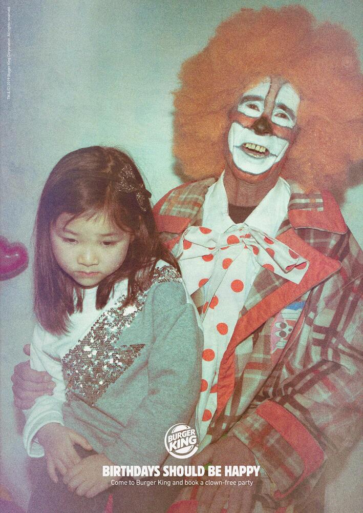 McDonald’s‘ın meşhur palyaço maskotunu ön plana çıkaran Burger King, bir çocuğun en eğlenceli günü olması gereken doğum günlerindeki mutsuz anları yakaladı. LOLA MullenLowe ajansının hazırladığı afişler maskot Ronald McDonald’ı hedef alıyor. Halinden memnun olmayan ve ağlayan doğum günü çocuklarının palyaçolarla poz verdiği anlar Birthdays should be happy (Doğum günü partileri eğlenceli olmalı) sloganıyla paylaşıldı. Şirket aynı zamanda başlattığı palyaçosuz doğum günü etkinliği ile birlikte müşterilerini palyaço bulunmayan bir doğum günü organizasyonu için Burger King’e çağırıyor.