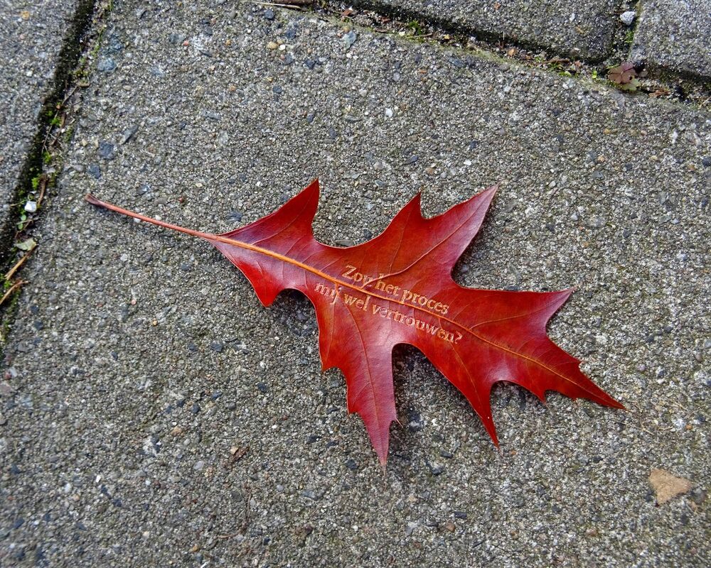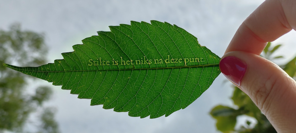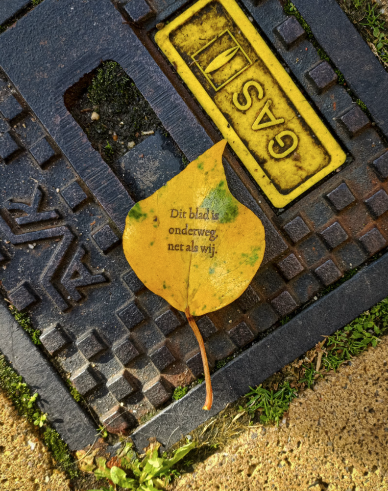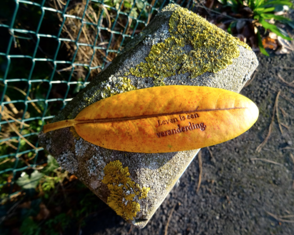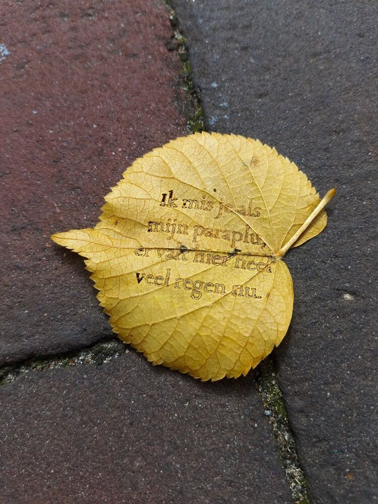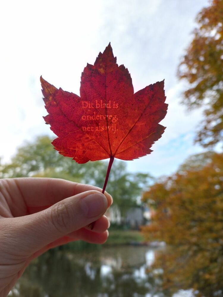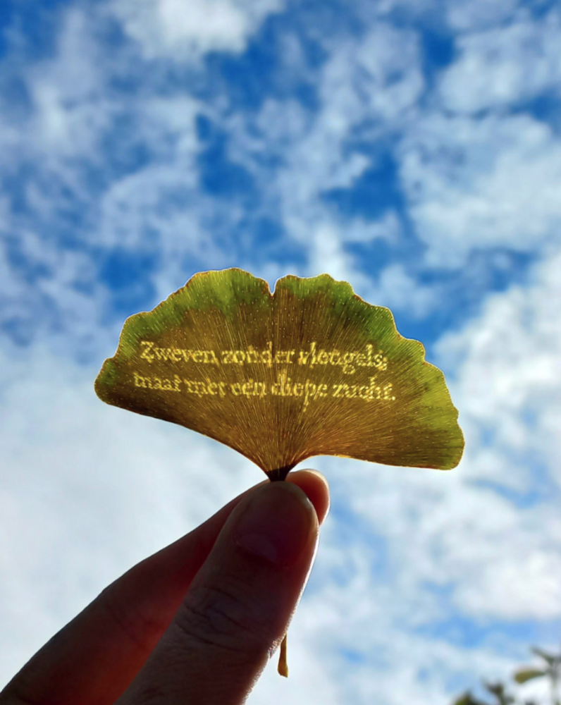 Hollandalı tasarımcı Merel Slootheer, Herfstvlinders (Sonbahar Kelebekleri) serisinde doğal malzemeleri kullanarak serbest bırakma (letting go) ve geçicilik temalarını araştırıyor. Proje, bitkilerden ve ağaçlardan düşen yaprakları şiirsel ifadenin geçici taşıyıcılarına dönüştürüyor. Metinler, yaprağın cildini biraz incelten bir bereleme/çürütme tekniğiyle yaprak üzerine işleniyor. Bu teknikle yaprak üzerine basılan metin geçici olarak görünür hale geliyor ve organik çürüme döngüsüne entegre oluyor. Metinler genellikle küçük şiirlerden ve düşüncelerden oluşuyor.
