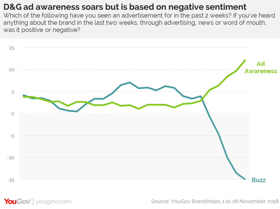 The Drum‘ın haberine göre söz konusu reklam kampanyası, Dolce&Gabbana’nın marka bilinirliği skorunun büyük ölçüde yükselmesine, marka sağlığı skorunun da büyük bir düşüş yaşamasına neden oldu. Paylaşılan verilerde Dolce & Gabbana’nın reklamlarını gören insanların sayısında büyük bir artış yaşandığı görülse de, bu artışın büyük ölçüde olumsuz duygulara dayandığını özellikle belirtmek gerek.