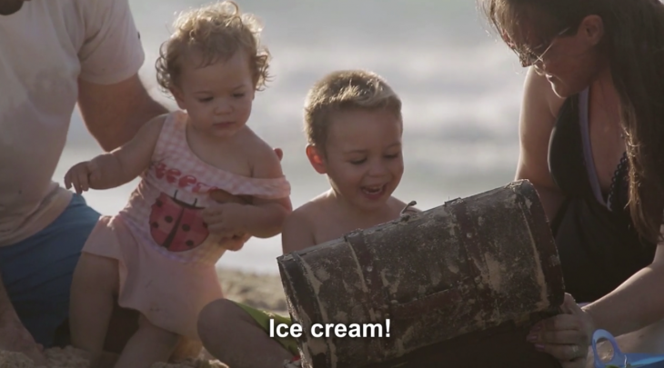 Bunun için sabah erkenden kumsala giden Strauss ekibi, içini dondurmalarla doldurduğu soğutmalı hazine sandıklarını kumsalın belirli yerlerine gömüyor. Daha sonra aileleri ile birlikte kumsalda oynayan çocukların ise bu sandıkları bulmalarını bekliyorlar. Çocukların içi dondurma dolu hazineyi bulduklarındaki sevinçleri ise görülmeye değer.