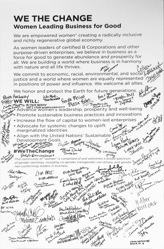 Geldiğimiz noktada, Amsterdam’daki buluşmada, öne çıkan noktalar ve kadınların katkı sağlaması için çağrı yapılan alanlar arasında İklim Krizi, Toplumsal Cinsiyet Eşitliği ve B Corp hareketine dair bulunduğumuz bölgede “farkındalık” çalışmaları yapmak, güçlendirme / güçlenme programları yürütmek ve ölçümlenebilir taahhütler vermek vardı. Hareketin beslendiği değerleri ve aksiyonları içeren çok değerli bir manifestonun imzacısı olmak da buluşmanın parçasıydı: We The Change.