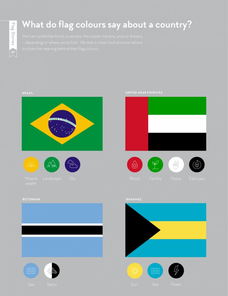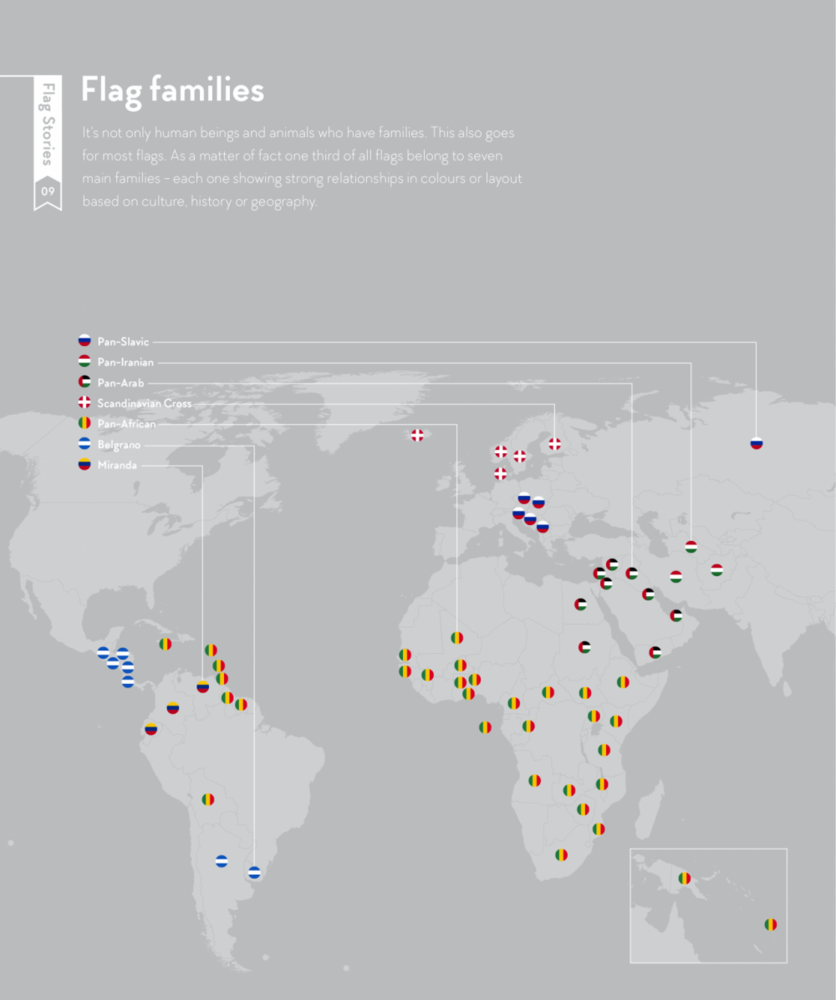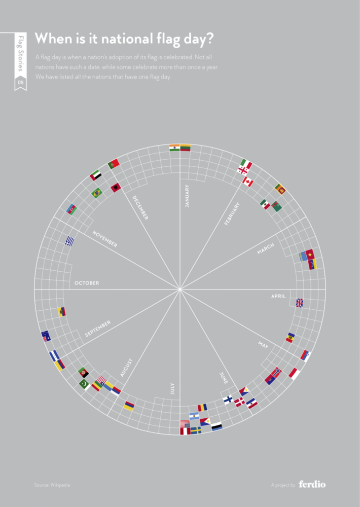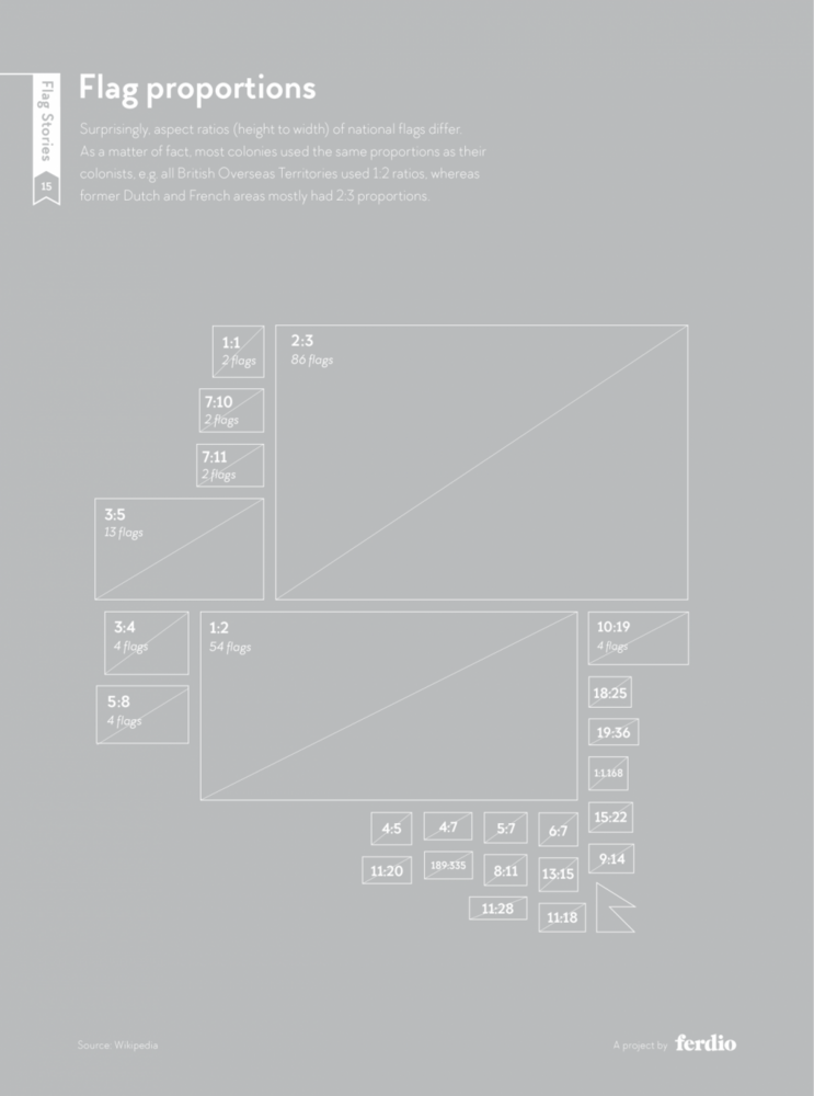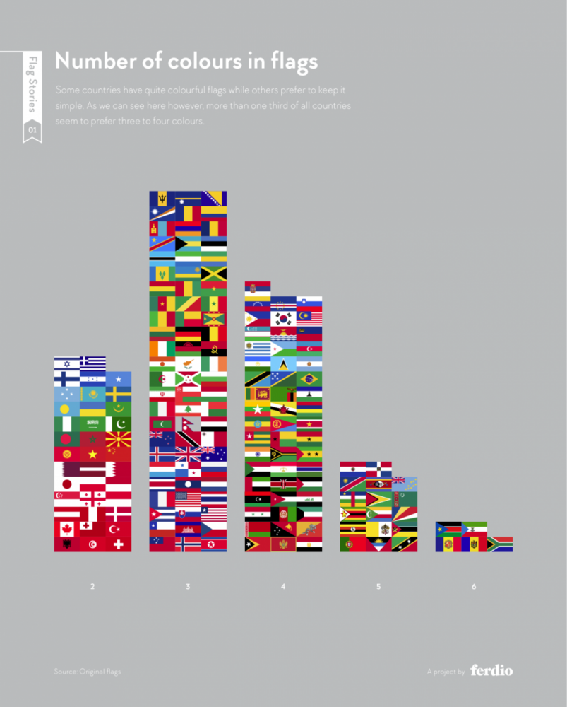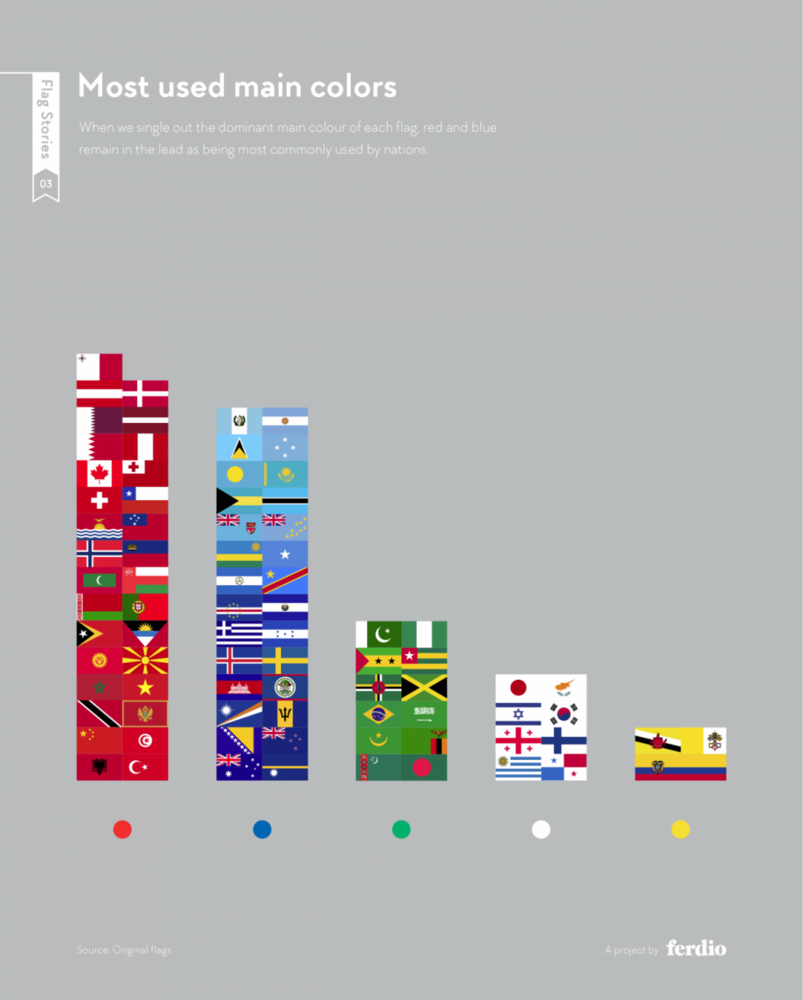 İnfografik ajansı Ferdio, bayraklara karşı olan tutkularını ayrıntılı analizlerle infografiklere dönüştürdüler. Ferdio, bayraklarda kullanılan çizgilerin konumları, semboller, hakim renkler, kıtalara göre dağılım, benzer tasarımlar, bayrak oranları ve nice metrikleri ele alarak Flag Stories‘i ortaya çıkarmış.