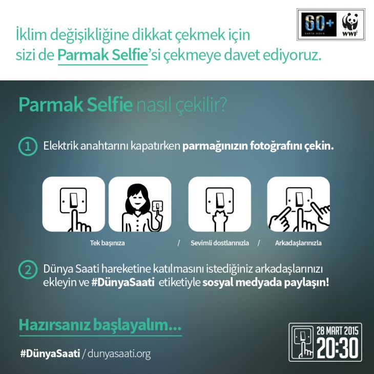 Kampanyaya 28 Mart’ta ışıklarınızı kapatmanın yanı sıra, sosyal medyadan #DünyaSaati hashtag’ini kullanarak çekeceğiniz “parmak selfie”nizi paylaşarak destek verebilirsiniz. Tabii aslında en büyük destek; 28 Mart dışındaki diğer günlerde de gereksiz enerji kullanımından kaçınmak.