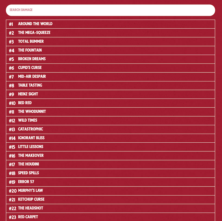 Kampanya için bir internet sitesi hazırlanmış. Bu sitede; reddedilen sevgilinin Heinz ketçabını sabotaj aracı olarak kullandığı “Aşk Tanrısının Laneti”, lekeyi yapan kişinin kayıplara karıştığı “The Whodunnit”, her şeyin suçlusu “Murphy Kanunları” gibi plan dahilinde olan bazı çılgın senaryolar listeleniyor. Örneğin “Murphy Kanunları”, ketçabın kıyafetin tek beyaz kısmına bulaştığı o inanılmaz ama fazlasıyla gerçek anları vurguluyor. Sıradan sigortalar gibi, Heinz’ın sigortası da muhtemelen asla gerçekleşeceğini düşünmediğiniz kazalar için telafi vaadinde bulunuyor.