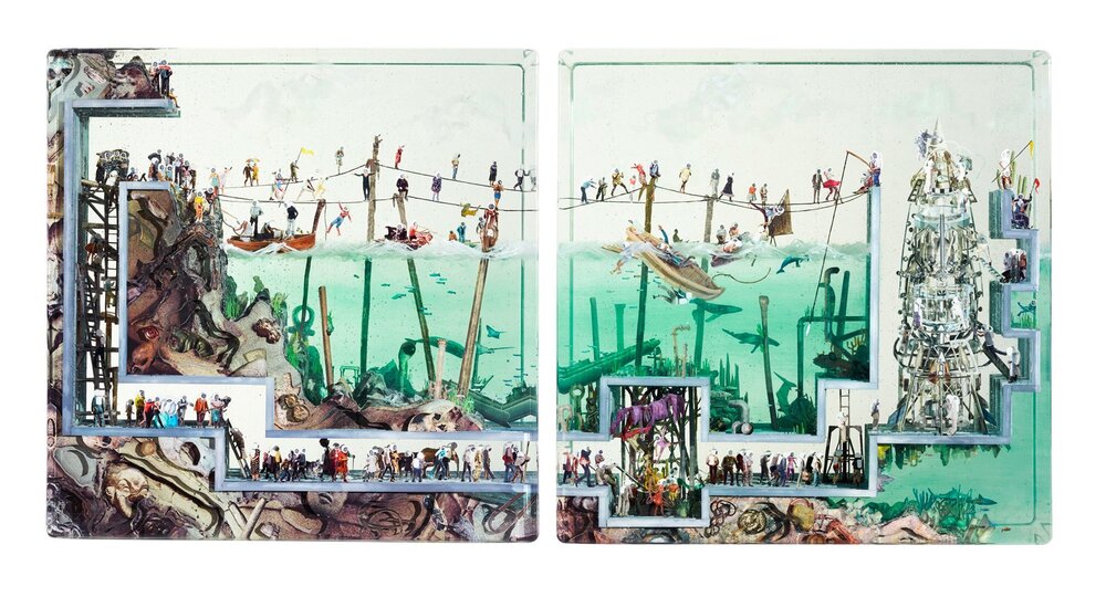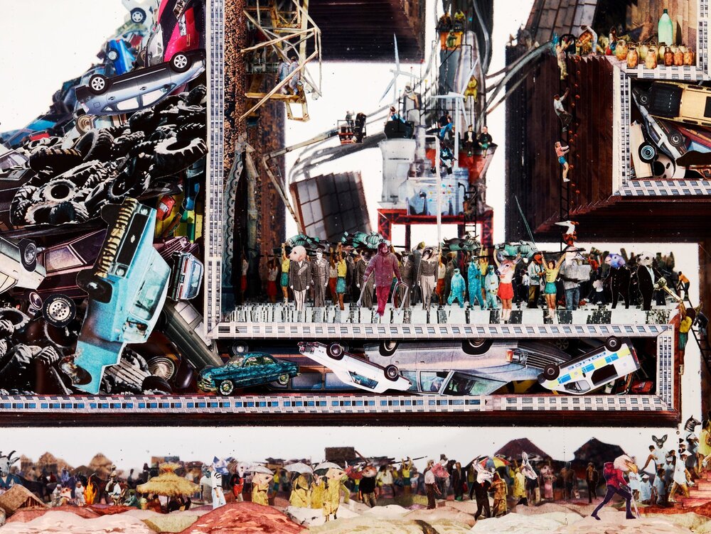 New York’lu sanatçı Dustin Yellin, şeffaf bloklar içine yerleştirdiği 3 boyutlu foto-kolajlarını “donmuş sinema” olarak tanımlıyor. Kolajlarda en çok dikkat çeken şeylerden biri teknolojiyle ilgili görüntülerin yoğun olması. Bazılarında bir grup insanı dev makineler ya da yapılar inşa etmeye çalışırken görüyoruz. İnsanlar şelalenin veya denizin altında roket inşa etmek için birleşmişler. Bu, yeryüzünde bazı bölgelerin sular altında kalacağını iddia eden distopya senoryalarıyla oldukça uyumlu bir sahne. Başka bir grup ise bir araba hurdalığının altında gizlice zaman makinesi inşa ediyor. Sanki bu insanlar bir kaos ya da kıyamet ortamında yaşıyor ve yok olmamak için çare arıyorlar. Ancak yaptıklarının çoğu aslında boşa gidiyor ve her seferinde başa dönüyorlar gibi. En azından Group Sisyphus adlı çalışma, izleyiciye bunu hissettiriyor. Detaylara baktığımızda şu anki dünyamıza teknolojik seviye açısından oldukça yakın ama biraz daha dramatize edilmiş sahneler yarattığını görüyoruz.