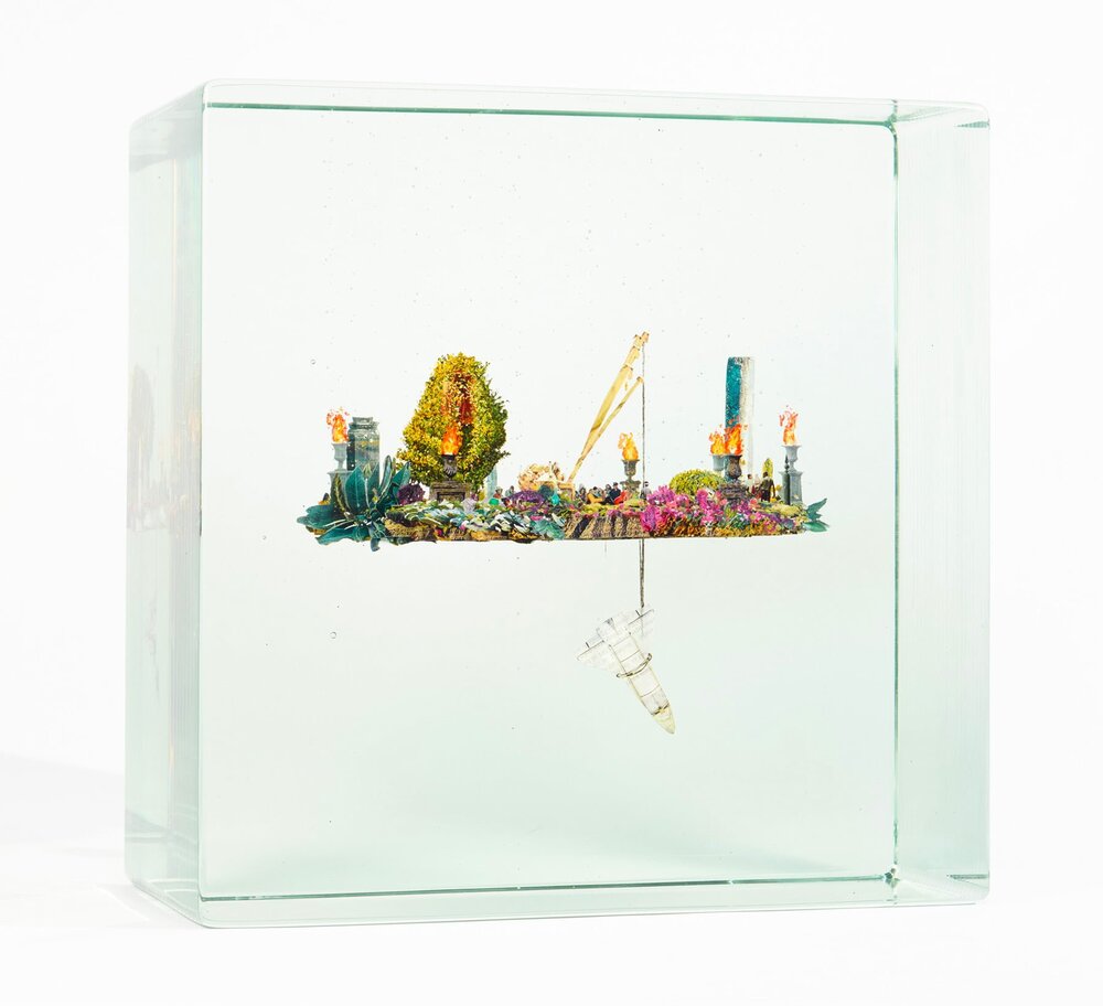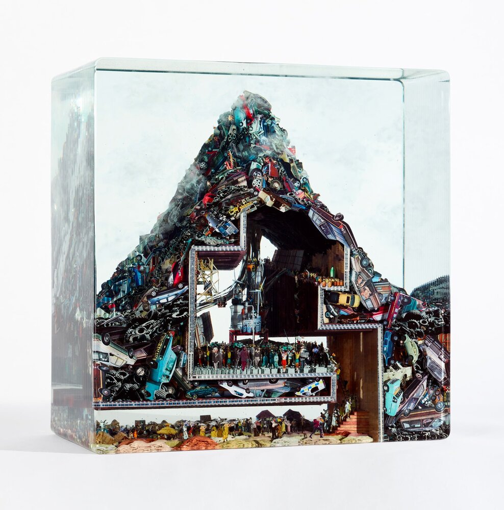 New York’lu sanatçı Dustin Yellin, şeffaf bloklar içine yerleştirdiği 3 boyutlu foto-kolajlarını “donmuş sinema” olarak tanımlıyor. Kolajlarda en çok dikkat çeken şeylerden biri teknolojiyle ilgili görüntülerin yoğun olması. Bazılarında bir grup insanı dev makineler ya da yapılar inşa etmeye çalışırken görüyoruz. İnsanlar şelalenin veya denizin altında roket inşa etmek için birleşmişler. Bu, yeryüzünde bazı bölgelerin sular altında kalacağını iddia eden distopya senoryalarıyla oldukça uyumlu bir sahne. Başka bir grup ise bir araba hurdalığının altında gizlice zaman makinesi inşa ediyor. Sanki bu insanlar bir kaos ya da kıyamet ortamında yaşıyor ve yok olmamak için çare arıyorlar. Ancak yaptıklarının çoğu aslında boşa gidiyor ve her seferinde başa dönüyorlar gibi. En azından Group Sisyphus adlı çalışma, izleyiciye bunu hissettiriyor. Detaylara baktığımızda şu anki dünyamıza teknolojik seviye açısından oldukça yakın ama biraz daha dramatize edilmiş sahneler yarattığını görüyoruz.