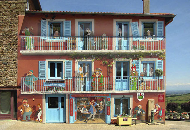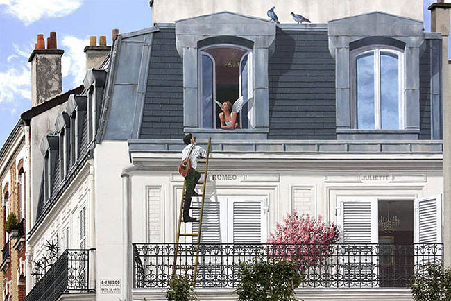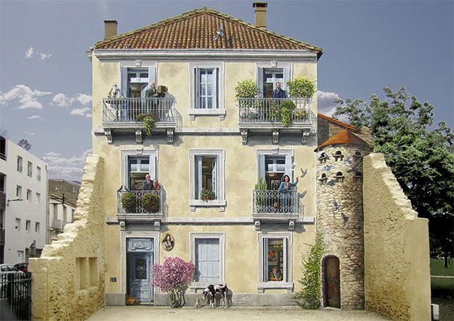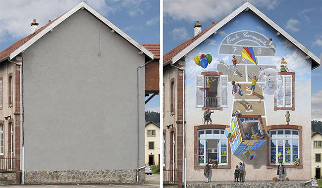 Fransız sokak sanatçısı Patrick Commecy, gerçek üstü duvar boyamaları yapıyor. Binaların ön ve yan cephelerini ekibiyle birlikte harika murallarla süsleyen ve bambaşka görünümlere kavuşturan Commercy’nin çizimleriyle yarattığı farkı öncesi ve sonrasına ait fotoğraflara bakarak daha net görebileceksiniz.