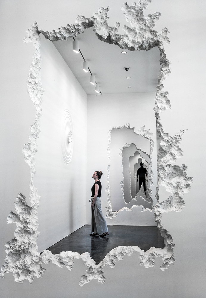 Rastgele kırılmış olan ilk duvarı takip eden, hemen ardında dizili duvarlar gitgite form değiştirerek en nihayetinde bir insan figürü haline getirilmiş. Kırılmış duvara tam karşıdan baktığınızda bir insan silüetiyle karşı karşıya geliyorsunuz. Sanatçının beton duvarlar üzerinde sergilenen önceki çalışmaları ise kırık duvarların arasındaki odacıkları süslüyor.