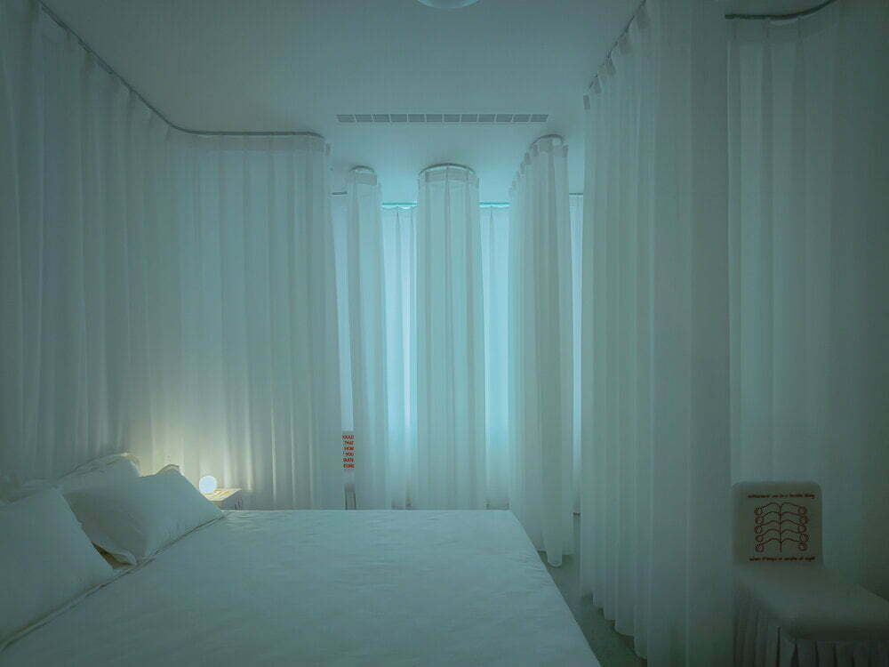 Çinli sanatçı ve tasarımcı Duyi Han’ı pandemi sürecinin ilk zamanlarında Hubei’de yaptığı muralla tanıdık. Virüsün Çin başta olmak üzere Uzak Doğu ülkelerini vurduğu 2020’nin henüz ilk aylarında sağlık çalışanlarının yaptıkları fedakarlıklara bir saygı duruşu niteliğinde olan dev mural tarihi bir şapelin duvarlarını dolduruyordu. The Saints Wear White adlı bu projesinin birçok baskısını da satan tasarımcı buradan elde ettiği karı COVID-19 mücadelesi kapsamında Dünya Sağlık Örgütü’ne bağışlamıştı. Hem dijital hem fiziksel ortamlarda çalışmayı seven Duyi Han, farklı ülkelerde çeşitli kültürlerle yaşamasının getirdiği birikimle insana odaklanan işler ortaya koyuyor. Bunlardan biri de Ordinance of the Subconscious Treatment isimli artBnB dairesi. Sanatçı, konaklamayı bir sanat deneyimine dönüştürerek mimari ve mobilya tasarımı aracılığıyla ruhsal sağlığa ve kültürel miras temalarına odaklanıyor.