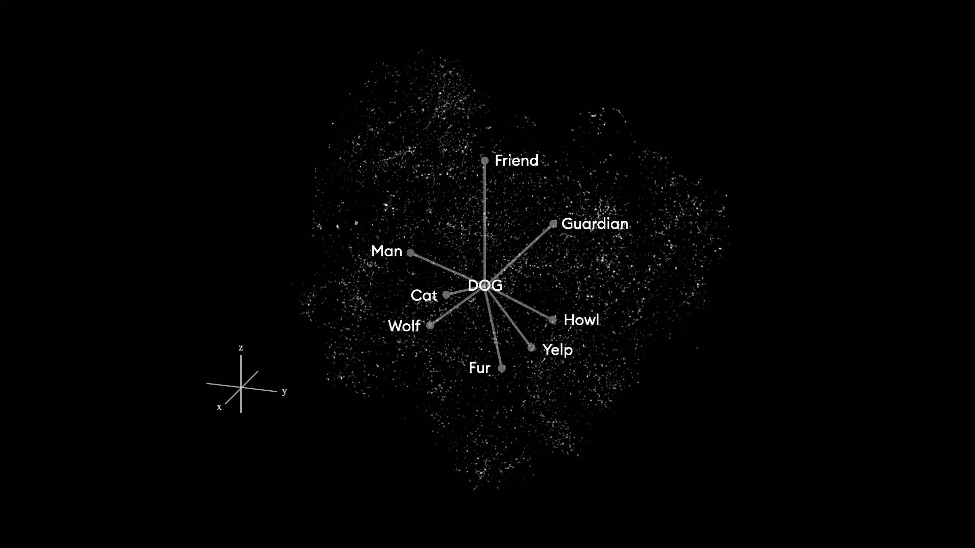 2017’de hayatımıza giren derin öğrenme teknolojisi ile dilleri çok boyutlu geometrik şekillere dönüşütürmek mümkün hale geldi. Büyük veri setilerini inceleyen derin öğrenme algoritmaları örneğin İngilizce dili üzerinde eğitildiğinde tüm kelime kavramların birbiriyle ilişkisini gösteren Yerleştirme Uzayı (Embedding space) bir görsel ortaya çıkıyor.