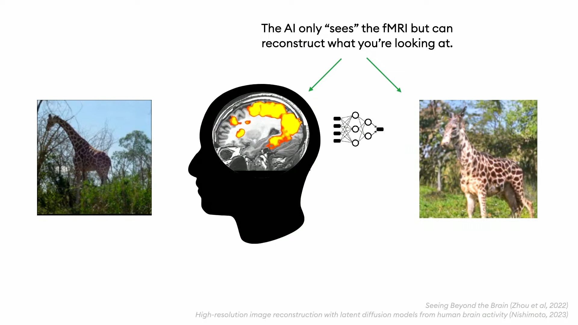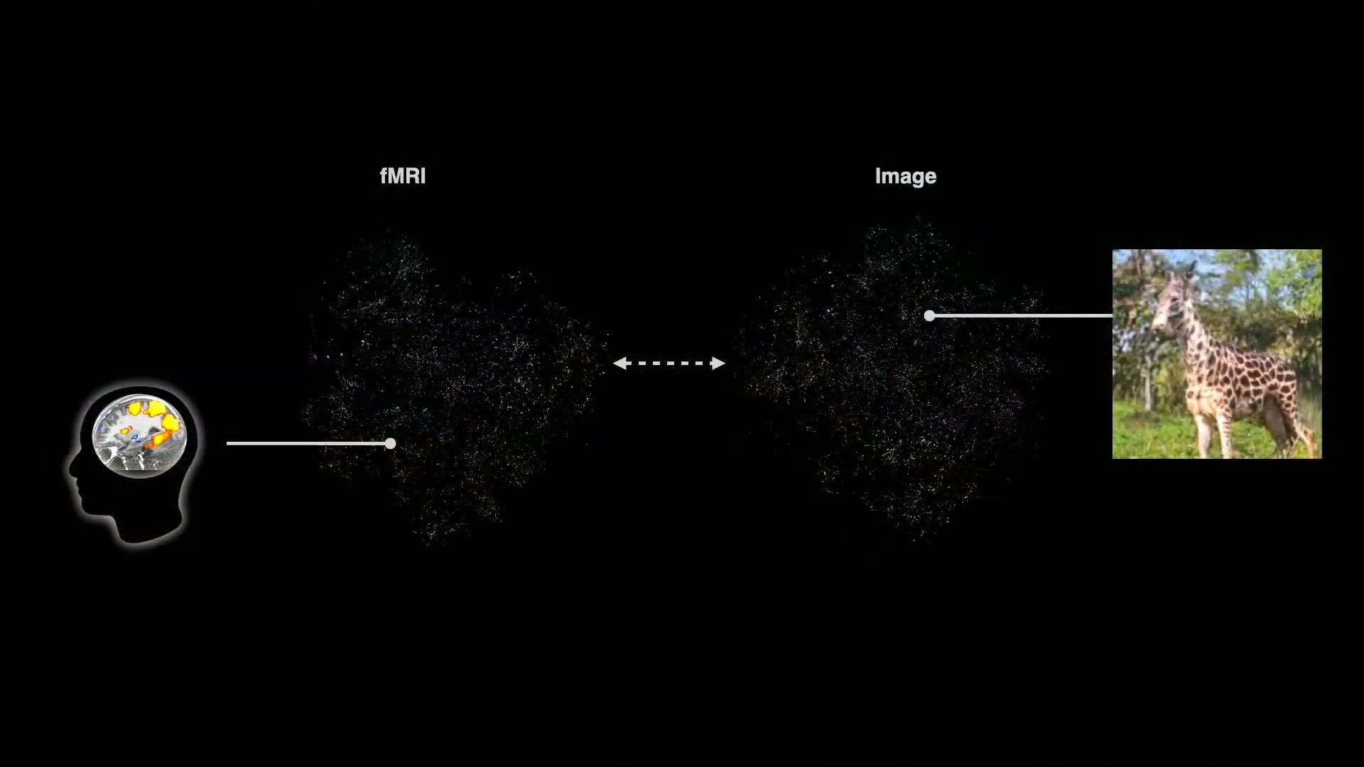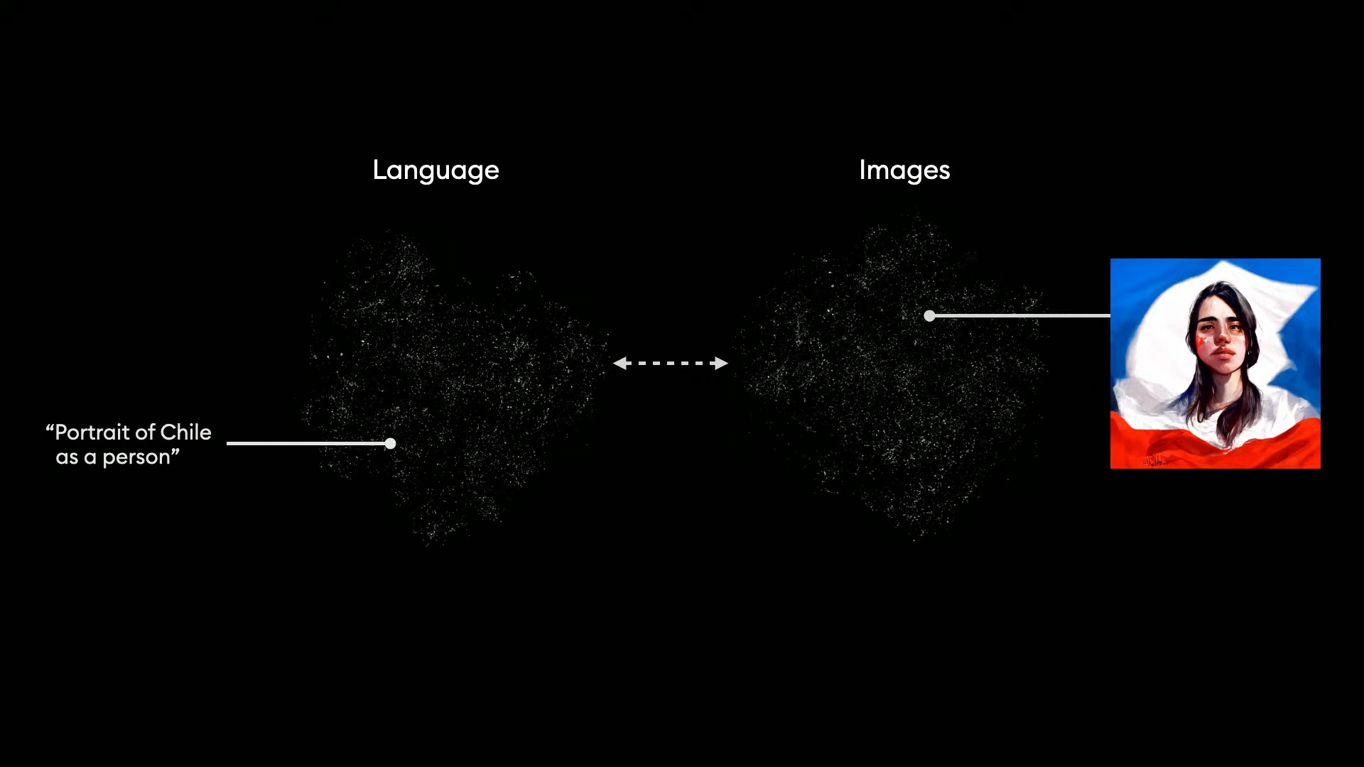 Dil için bir görsel şekil ortaya çıkarabiliyorsak, makine öğrenme benzer şekilde görseller için de bu geometrik şekili oluşturabiliyor. Görsel içindeki elementler arasındaki ilişkiye ve birbirlerine uzaklığına odaklanan benzer bir şekil bulutu bu da. Ancak konusu dil yerine imajlar. Dil şekli ile imajlar şekli arasındaki bu düzlem arasında bir karşılaştırma yaptığında da şekillerin benzediğini görmüş. Örneğin dil bulutu içinde “Kişi olarak Şili’nin portresi” tamlamasının görseller bulutu üzerinde de kavramın görsel karşılığına denk geldiğini görmüş. Benzer şekilde fMRI cihazıyla insan beynindeki hareketliliği veriye dönüştürüp yapay zekadan görselleştirmesi istendiğinde de o sırada kişinin gördüğüne yakın bir sonuç çıkıyor.