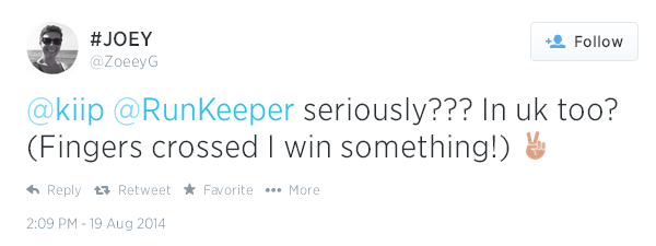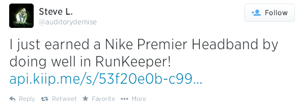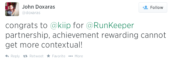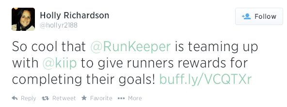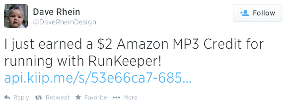 34 milyondan fazla kullanıcısı bulunan egzersiz takibi uygulaması RunKeeper da geçtiğimiz günlerde ilk reklam anlaşmasını Kiip’le yaptı. Kişileri sağlıklı ve hareketli bir yaşama teşvik eden uygulama, bu sayede artık egzersiz hedeflerini gerçekleştiren kullanıcılarını fitness temalı ürünlerle ödüllendirebilecek. Ödül kapsamına P&G Secret Deodorant, Propel Fitness Water gibi markaların bedava eşantiyonlarıyla markalar tarafından desteklenen bedava şarkı yüklemeleri de dahil edilmiş.