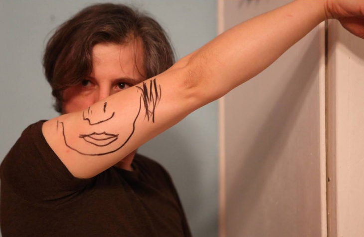 Eyeliner ve ruj yardımıyla dirsek, kol gibi noktalarda yarattığı benliklerin bir kısmını çiziyor. Ardından yüzünü bu uzuvla kapatarak yarattığı benliği kendi ifadesiyle dış dünyaya sergiliyor. Ortaya çıkan eserin yarısı sanatçının kendisiyken diğer yarısında çoklu kişiliklerinden biri yer alıyor. Bölünmüşlük ve modern toplumda yer almanın koşulu olan maskelerini Sebastian Bieniek, sanatçı vizyonuyla takıyor.