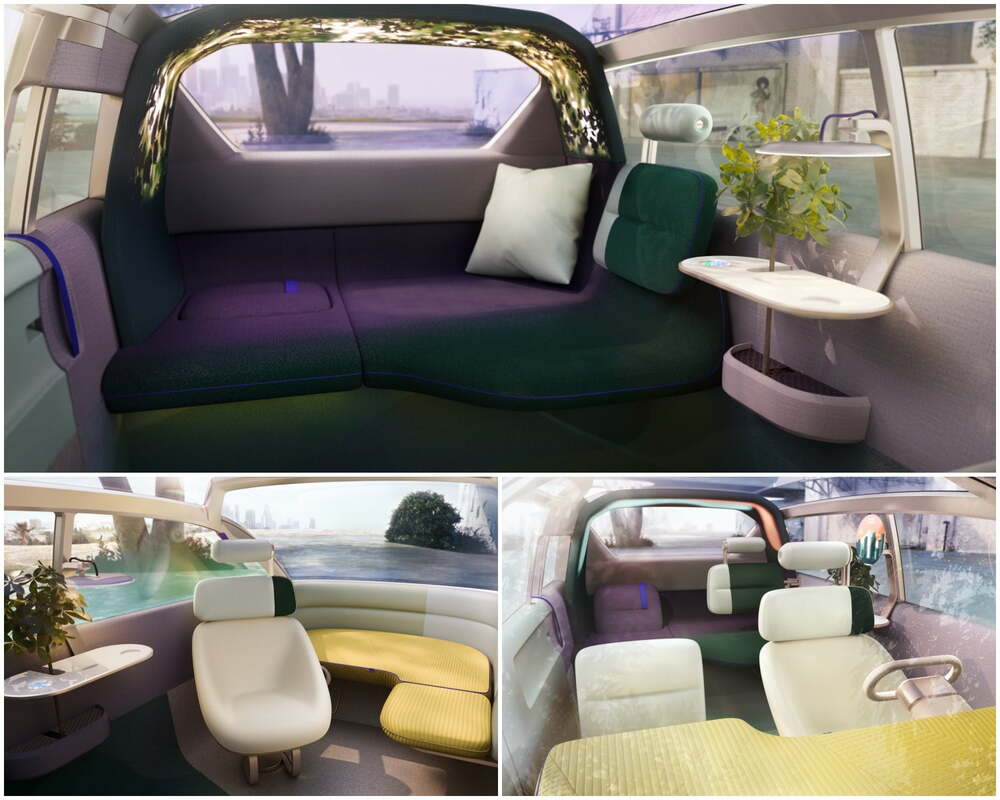 Tasarımcılar, dış cepheyi geliştirmeden önce ev mobilyaları, ahşap modeller ve artırılmış gerçeklikten faydalanarak geniş bir iç mekan deneyimi yaratıyor. Tasarımda ev rahatlığını sunmak öne çıkıyor. Esnek dört koltuk düzeni iç mekanın ana unsurunu oluşturuyor. Koltuklar hareket ettirilebiliyor. Gösterge paneli araç hareketsiz haldeyken alçalıyor ve sürücü alanı genişletilerek rahat bir alan sunuluyor. Kabinin arkasında yer alan aydınlatma ise sessiz ve konforlu bir alan ortamı yaratıyor. Buna ek olarak ön cam araç park halindeyken yukarı doğru açılabiliyor. Minik bir balkon ambiyansı yaratılabiliyor.