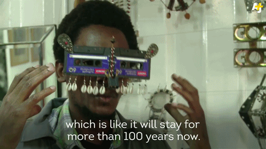 Nairobili sanatçı Cyrus Kabiru, elektronik atıkların dünyasında geri dönüşümle anlam kazanan gözlükler üretiyor.