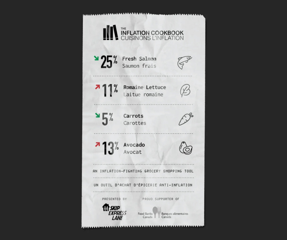 Kullanıcılar, bütçe ve tüketim alışkanlıklarına göre uygulamanın arayüzünü kendileri için özelleştirebilir ve sık kullandıkları ancak fiyatları sürekli oynayan ilk 10 malzemenin değişimlerini düzenli olarak takip edebilirler. Mobil web tarayıcılar üzerinden erişilebilen Inflation Cook Book projesi, sekiz milyondan fazla Kanadalının artan gıda maliyetiyle başa çıkmak için son zamanlarda öğün atladığını belirten Dentsu Creative Canada iş birliğiyle hayata geçirildi.