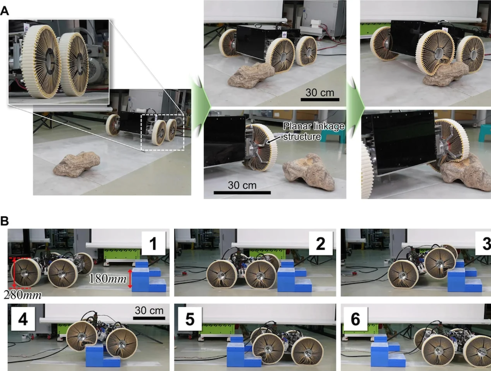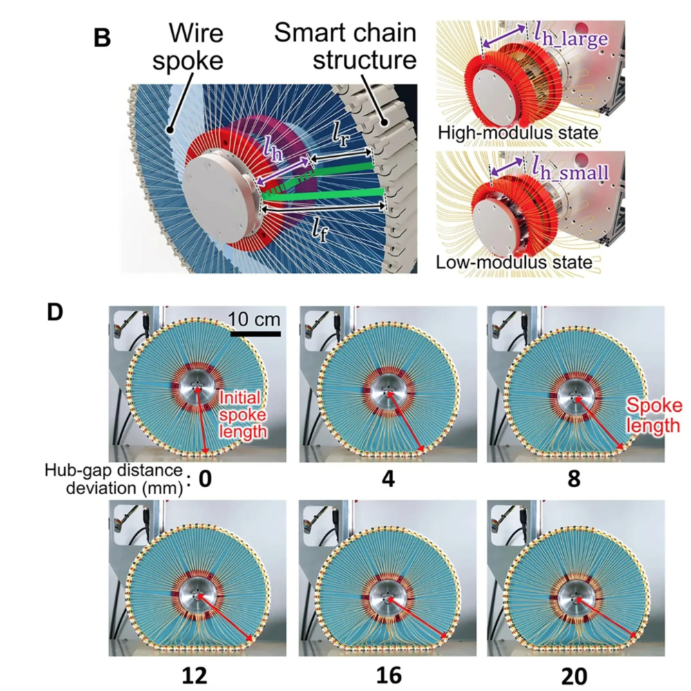 Bu deforme olabilen tekerlek, tekerleğin dışındaki bloklardan oluşan ve merkezi göbeğin karşıt taraflarına tel çubuklarla bağlanan bir “akıllı zincir yapısına” sahip. Demo videosunda, tekerleğin deforme olup yüzeye uyum sağlayabildiği ve böylece karşılaştığı engellerin üzerinden geçebildiği görülüyor. Hem doğal engebeleri hem de basamak gibi insan eliyle yapılmış engelleri aşmakta başarılı oluyor.