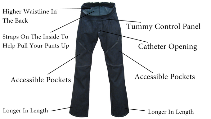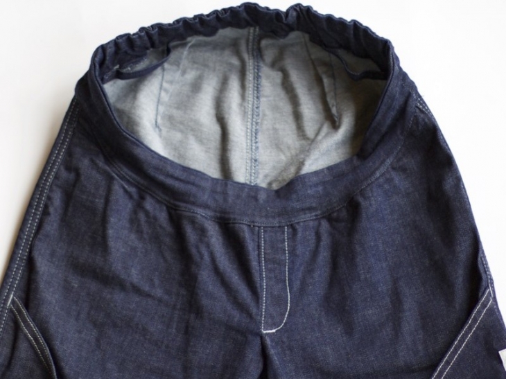 Pantolonlar, oturularak kullanılacağından arka cepler iptal edilerek, ön-yan kısımda bulunan geniş cepler ulaşım kolaylığı açısından dizlere yakın konumlandırılmış. Arka kısmı öne göre daha yüksek bel kesime sahip olan pantolonlar sonda kullanımına da uygun. Oturunca pantolonlar yukarıya çekildiği için paçalar normalden uzun bırakılmış. Pantolonu tek başına giyerken kolaylık olsun diye iki yanına tutacaklar yerleştirilmiş ve yine aynı amaçla kot kumaşında bir miktar elastik malzeme kullanılmış.