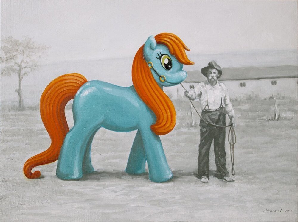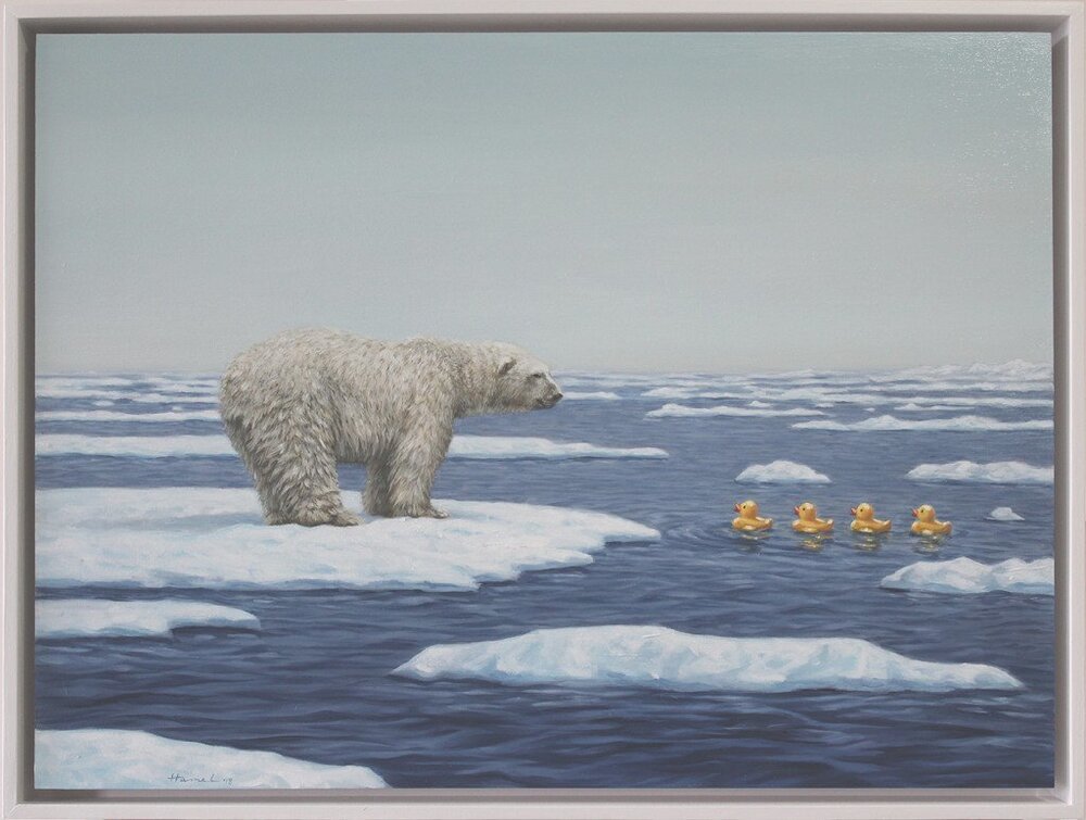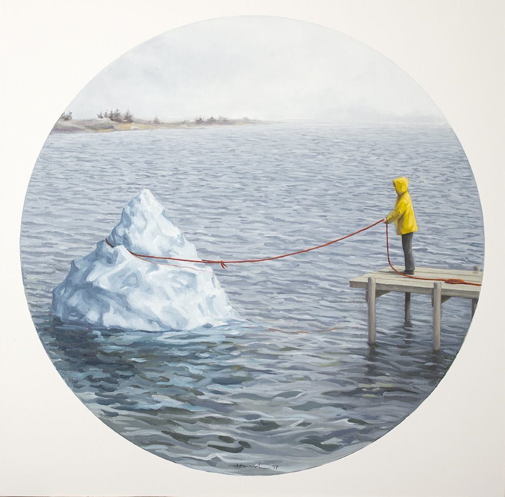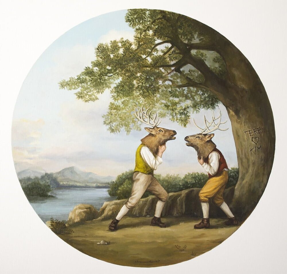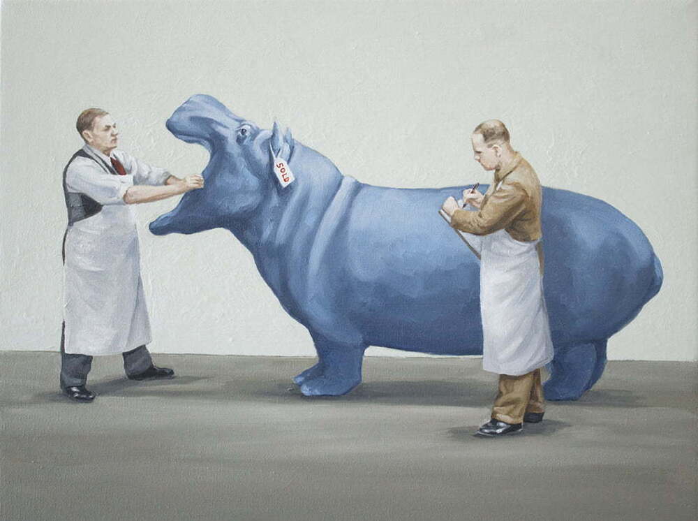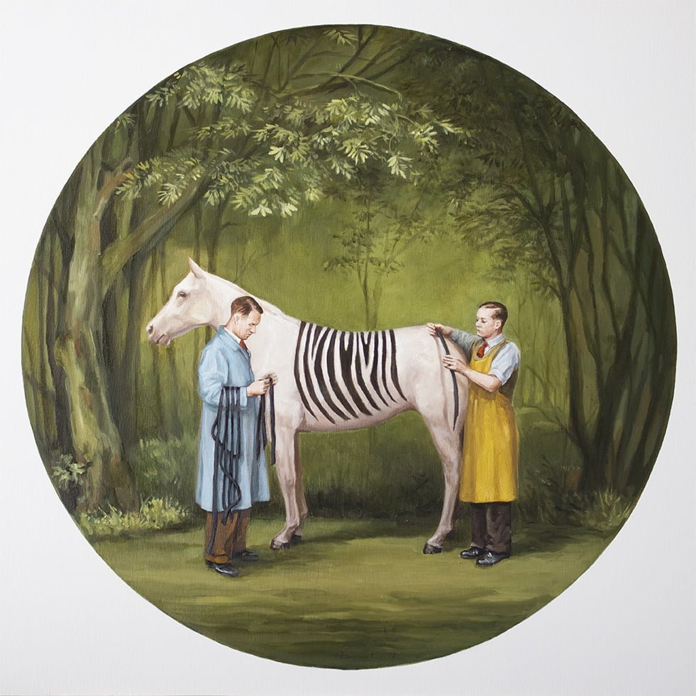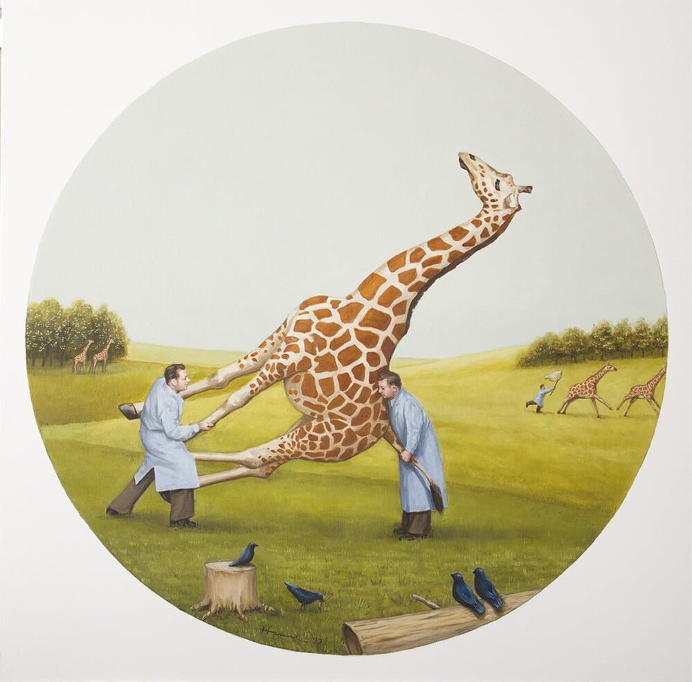 Toronto’da yaşayan sanatçı Toni Hamel de insan davranışlarını analiz eden çizimler, resimler ve heykeller yapıyor. Sanatçının iki boyutlu çalışmalarında, laboratuvar önlükleri giymiş erkekler görebilirsiniz. Toni hayvan ya da buzdağı gibi imgeler kullanıyor. Erkek deneklerin zebralar, zürafalar ve balinaları analiz ettiğini ya da değiştirdiğini görüyorsunuz. Bazıları lekelerin boyuyor ya da belirginleştiriyor hatta. Sanatçı burada hayvanları ve doğadan referans aldığı görselleri kullanarak erdem, ahlak, iyilik ve kötülük gibi kavramları inceliyor.