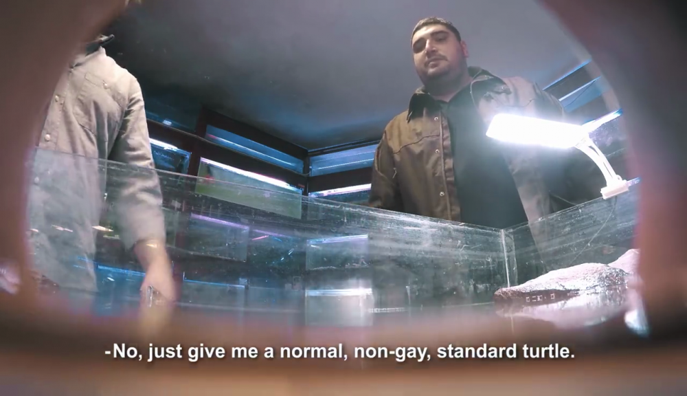 Bir pet shop’ta 3 gün boyunca 8 gizli kamera eşliğinde kaplumbağa “satın almaya” gelen sıradan insanlarla mağaza yetkilisinin konuşmalarına tanık oluyoruz. Şirin, tatlı, şeker, güzel renkli gibi sıfatlarla övülen kaplumbağalar hakkında eşcinsel oldukları bilgisi paylaşılır paylaşılmaz “satın alma” kararlarından vazgeçiyorlar.