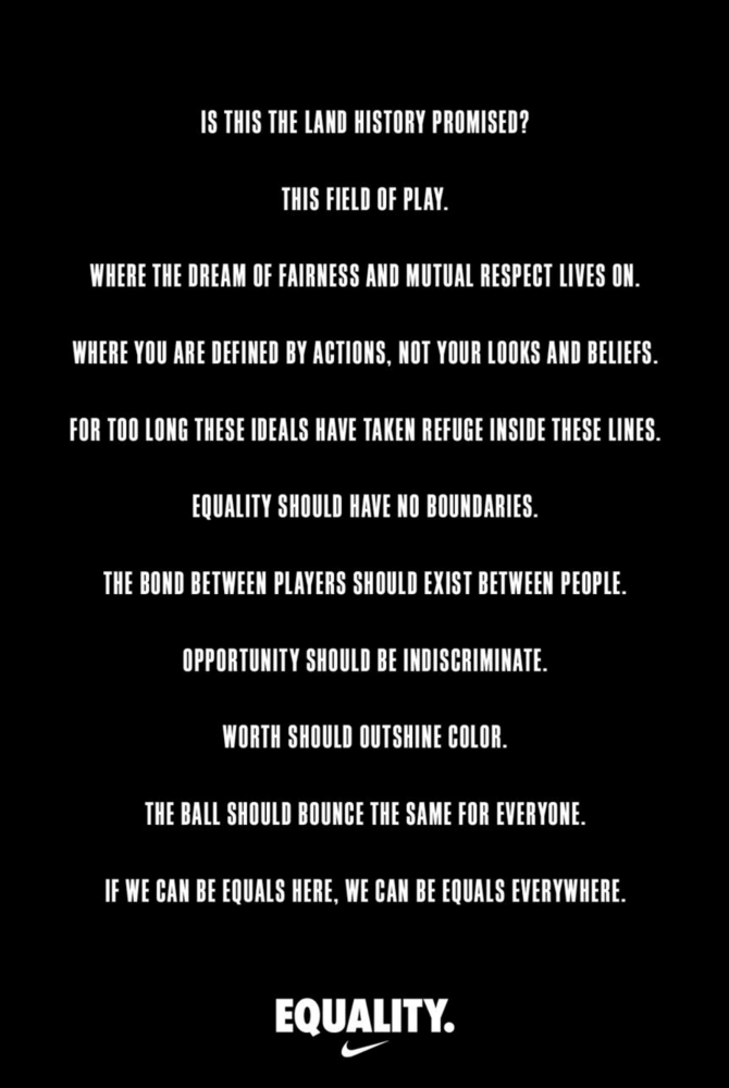 Wieden & Kennedy Portland tarafından yaratılan 90 saniyelik film yaptığı eşitlik vurgusu ve etkileyici görselliği ile oldukça çarpıcı. Filmde spor dünyasından pek çok ünlü isim göze çarpıyor. LeBron James, Serena Williams, Kevin Durant, Victor Cruz, Megan Rapinoe, Dalilah Muhammad ve Gabby Dougla’ın rol aldığı filmin dış sesi, oyuncu Michael B. Jordan tarafından seslendiriliyor. Filmin fonunda duyulan şarkı ise filmde eşitlik yazılı bir duvarın önünde piyano çalarken görünen Alicia Keys’in yorumuyla Sam Cooke’un meşhur “A Change Is Gonna Come” şarkısı.