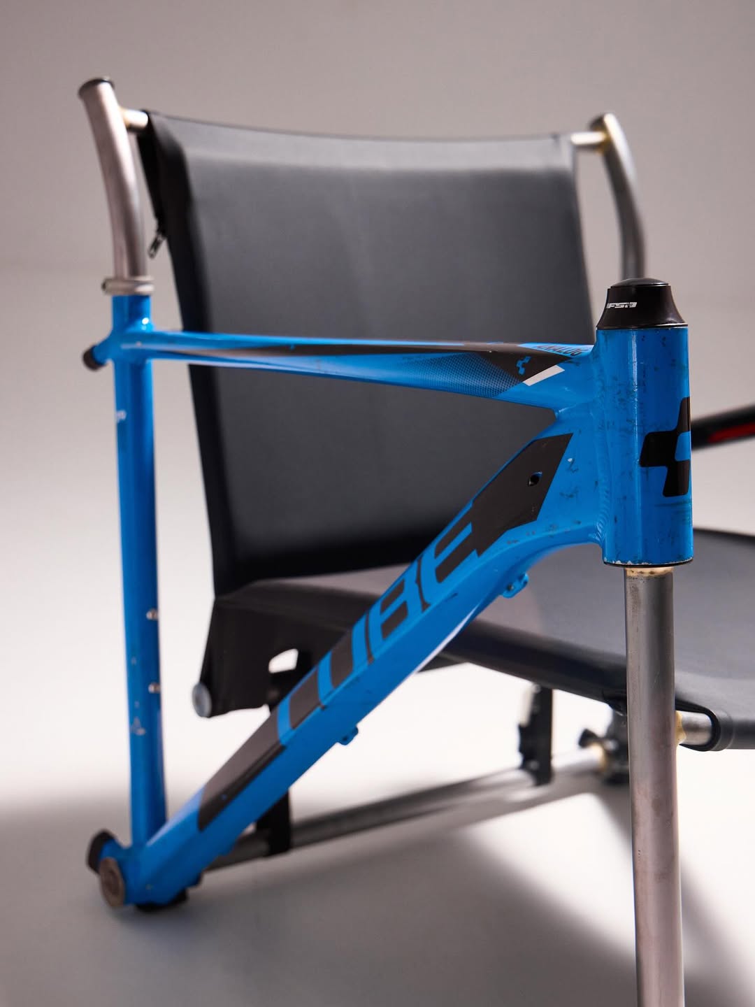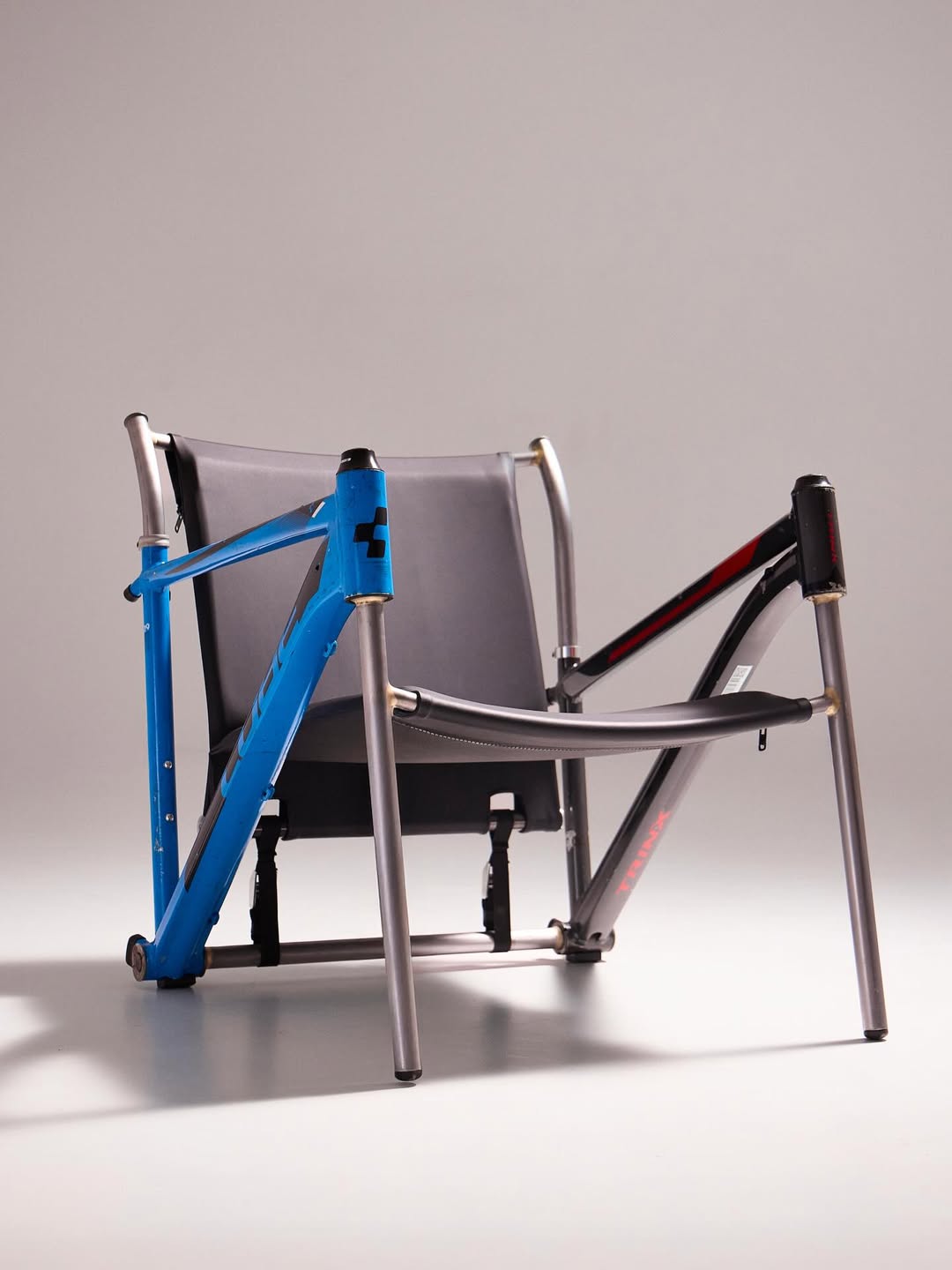 Kahan’ın tasarımlarında iki eski bisiklet kadrosu simetrik biçimde yerleştiriliyor. Maşa ve zincir bacaklarının uçları zemine temas ederek ayak görevi görüyor, üst boru ise kolçak olarak kullanılıyor. Ortaya çıkan sonuç, rahat oturma pozisyonuyla Barcelona sandalyesi benzeri bir görünüm sunarken, kullanılan malzemenin açıkça okunabilir olması sayesinde yapay değil, doğrudan inşa edilmiş bir nesne hissi veriyor.