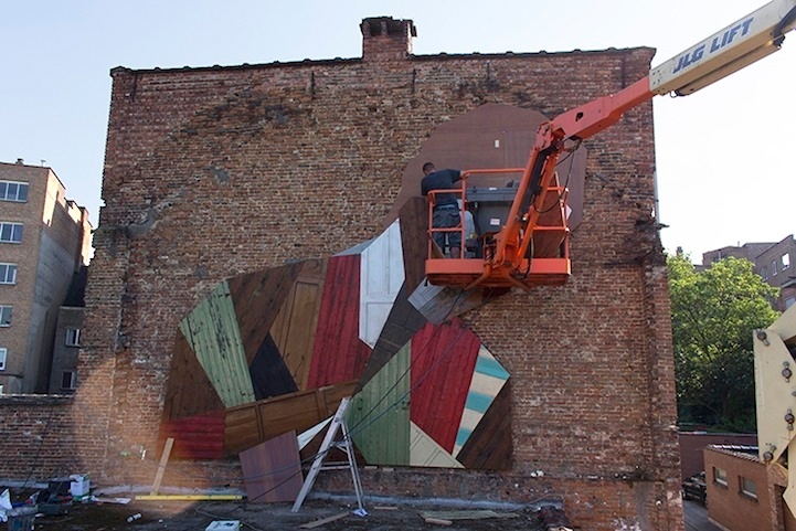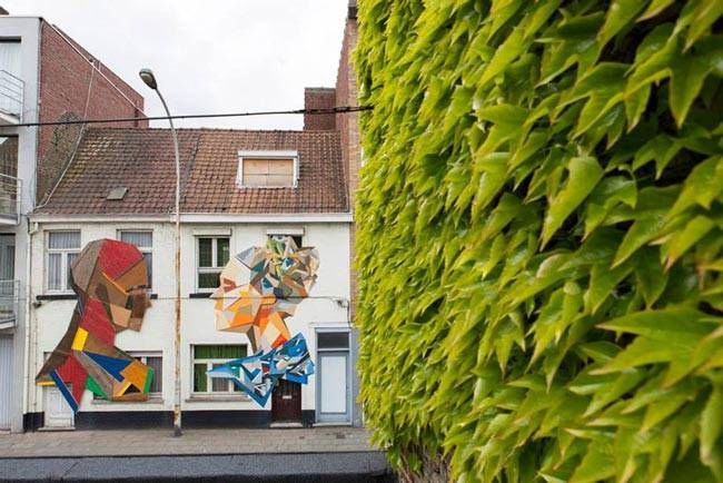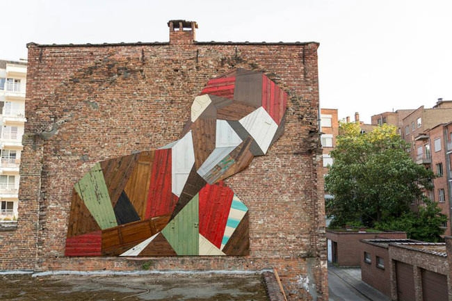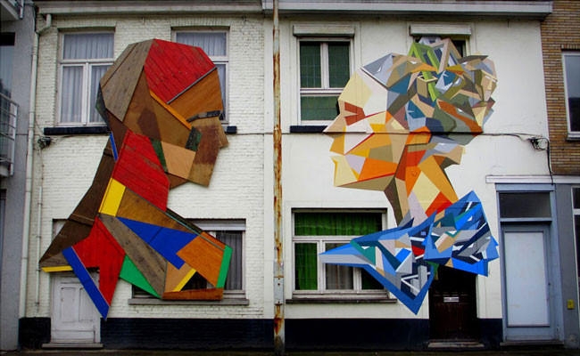 Sprey boyalarla, çeşitli baskı teknikleriyle yapılmış, sokakları renklendiren, güzelleştiren duvar resimlerine zaten bayılıyoruz. Belçikalı sanatçı Stefaan De Croock ya da diğer adıyla Strook, duvar üzerine yaptığı figürleri sprey boya yerine, renkli ahşap paneller, eski tahta kapılar, parke ve mobilya parçalarını kullanarak yapıyor ve zaten sevdiğimiz sokak sanatını bambaşka bir boyuta taşıyor. Ortaya çıkan eserler harika!