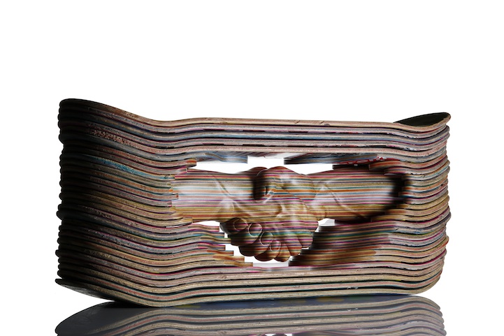 Haroshi, parçaları kimi zaman mozaik şeklinde birleştiriyor, renklendiriyor ve cilalıyor. Erken yaşlarda kaykay yapmaya başlayan Tokyo merkezli oyma sanatçısı, onlarla yeterince haşır neşir olduğu için kaykaylara ve taşıdıkları temel özelliklere fazlasıyla aşina. Dış hatlarında farklılık gösteren marka ve modelleri iyi bildiği için kaykay tahtalarını birbiri üzerine mükemmel şekilde oturtabiliyor.