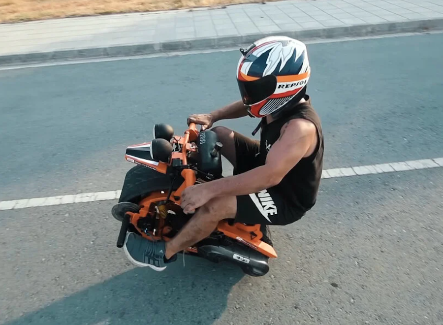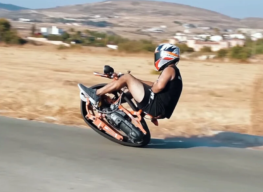Videosun final kısmında görebileceğiniz üzere sürücü – Make It Extreme ekibinden biri- bu aracı geriye doğru yaslanarak sürüyor. Videonun ilk bölümünde Make It Extreme ekibinin, otomobil lastiğini ileri dönüştürüp iki tarafını çıkardığı görülüyor. Böylece lastik daha yumuşak ve motor gövdesine yerleştirilmesini kolaylaştıran bir palete dönüşüyor.