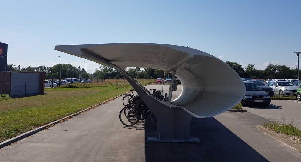 Danimarka'da rüzgar türbini kanatları, kapalı bisiklet park alanı olarak yeniden kullanılıyor.