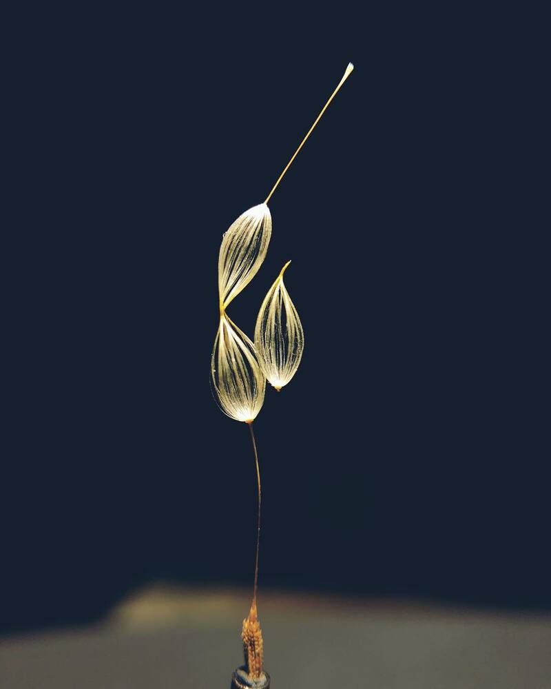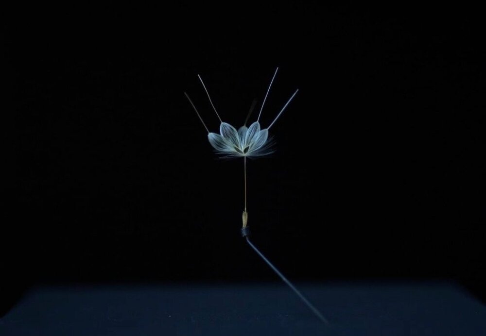 Papatyagiller familyasından yaygın bir bitki türü olan karahindibayı, sarı çiçekleri ömrünü tamamladıktan sonra sihirli bir top gibi tohumlarıyla birlikte görürüz doğada. Hatta üflediğimizde ya da hafif bir rüzgar çıktığında tohumları uçar, bu nedenle kendisine püf çiçeği de deniliyor. Tokyo’da yaşayan sanatçı euglena ise bu tohumları, mikro heykelleri için bir malzeme olarak kullanmaya karar vermiş. Ortaya bir hapşırıkla bile sarsılabilen oldukça narin, soyut heykeller çıkmış. Tüm hassaslıklarına rağmen yine de olabildiğince sabitlenmiş ve sergilenmeye hazır görünüyorlar.