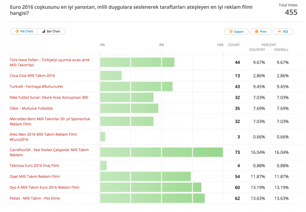 Yaptığımız anket sonucu Euro 2016’da Türkiye A Milli Futbol Takımı’nın resmi sponsor ve tedarikçileri arasında bulunan markalar tarafından hazırlanan 12 reklam filminin oy oranları: