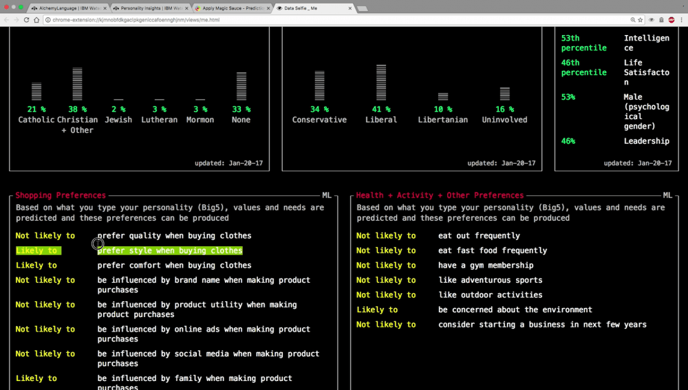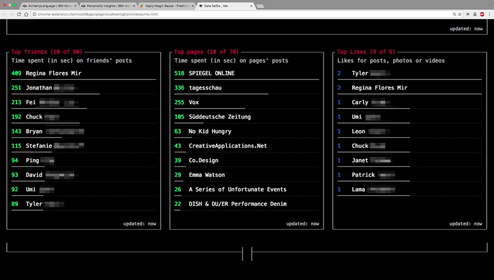 Regina Flores Mir ile Do Thi Duc’ın birlikte geliştirdiği Data Selfie, yüzleşmek istemediğimiz bir dünyaya giriş yapısı oluyor. Çünkü paylaştığımız veriyi IBM Watson ve Cambridge Üniversitesi’nden temin edilen doğal dil işleme ve makine öğrenme algoritmaları yardımıyla anlamlandırıyor. Bunun karşılığında da Data Selfie‘mize baktığımızda yakın arkadaşlarımızı, sevdiğimiz sayfaları ve en çok beğendiğimiz kişileri listeliyor. Ve tabii ki bu buzdağının görünen kısmı. Data Selfie’nin sunduğu raporlar arasında durum olarak yazdıklarımız ve baktığımız içerikler karşılaştırılarak kişilik analizi, dini görüş, politik görüş ve alışveriş alışkanlıkları gibi detaylı analizler yer alıyor. Ve Facebook’un aksine, Data Selfie ile topladığınız veri sadece kendi bilgisayarınızda kalıyor ve istediğiniz zaman tamamen silebiliyorsunuz.