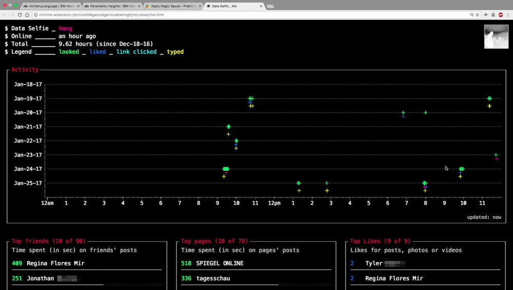 Vietnam kökenli Alman araştırmacı Hang Do Thi Duc, Facebook’un kişisel veri toplama mekanikleri üzerinden giderek aynada dijital personamızı görmemizi sağlayan Data Selfie isimli Chrome eklentisi geliştirdi. Data Selfie’yi tarayıcımıza yüklediğimiz zaman Facebook’tayken okuduğumuz, beğendiğimiz, tıkladığımız ve hatta durum güncellemesi olarak yazdığımız veriyi yerel olarak depoluyor ve istediğimiz zaman analiz etmemizi sağlıyor. Yani Facebook ne yapıyorsa onu yapıyor.