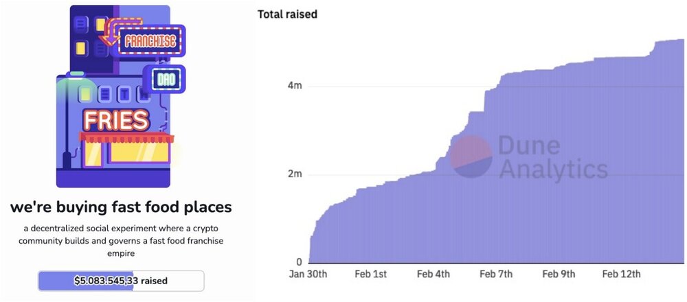 Fikrin çıkış noktası topluluk olarak gerçek dünyada bir fast food operasyonu yönetmek ve bu sistemi genişletmek. Hedefin 10 milyon dolardan daha az olduğu DAO mekanizmasında 5 milyon dolar barajı aşılmış durumda. Fon yaratan üyelere patates kızartması şeklinde bir tür sembolik jeton tanımlanırken katılımcılar sahip oldukları jeton sayısıyla orantılı olarak karar verme mekanizmasında yerini alıyor.