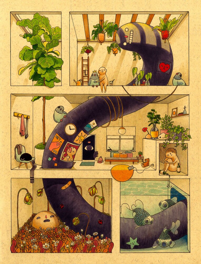 Kendi fantastik evrenini yaratan çizerler arasında bazı isimler aklımıza kazındı. Örneğin; uzay ormanları, rengarenk kara deliklere ve neon denizler çizen Bang Sangho bana göre yer verdiğimiz en çarpıcı çizerlerdendi. Londra’daki sokak yaşamının yer üstü ve yer altı katmanlarını tamamen hayali bir dünyaya dönüştüren Marija Tiurina ve tuhaf yaratıkların ustası Alex Heywood da unutulmazlar arasında. Bu keşiflerimizin arasına katılan yeni isim ise Felicia Chiao.