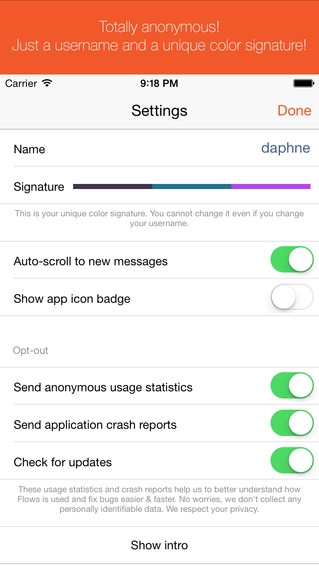 Altyapı otomatik olarak oluştuktan sonra “flow” ismini verdikleri kanallar üzerinden insanlara ortak hobilerini konuşma fırsatı sunuyor. Günümüzün en büyük çekincelerinden biri olan gizlilik konusunda ise Flows tamamen sizin yanınızda yer alıyor. İnternet bağlantısı kurmadığı gibi herhangi bir sunucuya da bağlanmadığı için işlem verileri kayıt altına alınmıyor. Bu sayede tüm kullanıcılar anonim olarak uygulamaya erişiyor. Kullanıcı adı ve 3 adet özel renk ile kullanıcılar hesaplarını kişiselleştirme imkanı buluyor.
