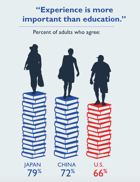 Deneyimin eğitimden daha önemli olduğunu düşünen insanların oranı Japonya’da %79, Çin’de %72, Amerika’da ise %66 oranında.