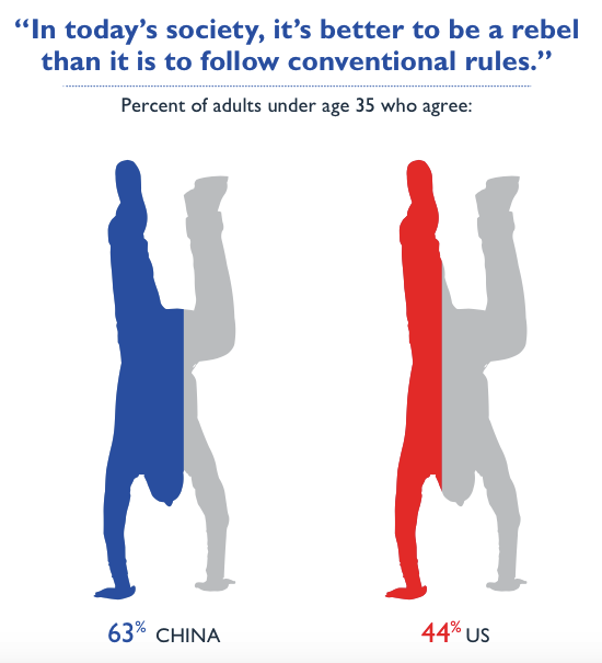 35 yaş altındaki Çin’lilerin %63’ü, Amerika’lıların ise %44’ü standart kurallara uymaktansa karşı gelmenin (gelebilmenin) daha iyi olduğunu düşünüyor.