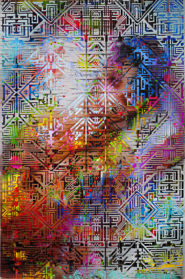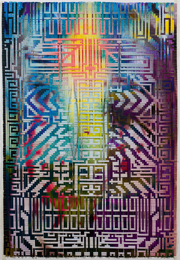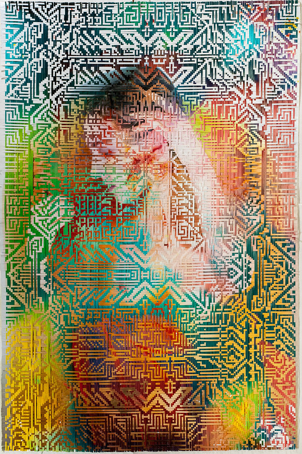 New Yorklu sanatçı Lala Abaddon, büyük ölçekli dokumaları andıran girift yapıdaki çalışmalarını çeşitli baskı ve fotoğrafları kullanarak yapıyor. Abaddon, fotoğraf ve baskıları keserek onları ilk olarak yüzlerce şerit haline getiriyor ve parçaları elde dokuyarak resmi yeni dokuma desenleriyle tekrar oluşturuyor.