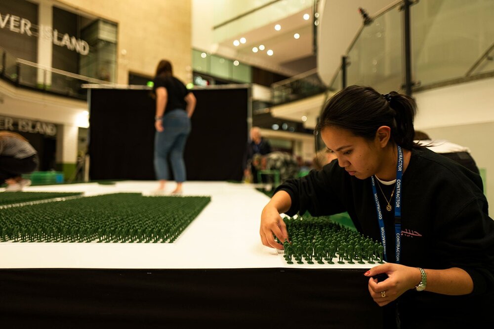 McCann direktörü Mike Oughton figürlerin birleştirildiğinde bir tenis kortunun üçte birini kapladığını ifade ediyor. Oughton, sayıları bu kadar fazla olan insanları dikkat çekici ve düşündürücü bir şekilde sunarak halkı harekete geçirmek istediklerini söylüyor. Böylelikle klasik oyuncak asker motifini temel alarak silahlarını bırakmış eski askerlerin heykelciklerini ortaya çıkıyor.