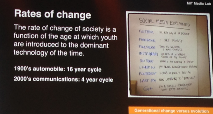 Değişimin Oranı: Lippman konuşmasına, kuşaklar arasındaki teknoloji gelişim hızını açıklayarak başladı. Yaşadığınız zamanın en önemli teknolojik ürününe o dönemde genç nüfusun erişim yaşı üzerinden yapılan bu hesaba göre, 1900’lerde otomobil dominant teknolojik üründü ve bir otomobil kullanmak için ABD’de 16 yaşında olmanız gerekiyordu. 2000’lerde ise dominant teknoloji iletişim. Akıllı telefonlara ve tabletlere erişim de bu zaman aralığında ortalama 4 yaşına kadar düştü.