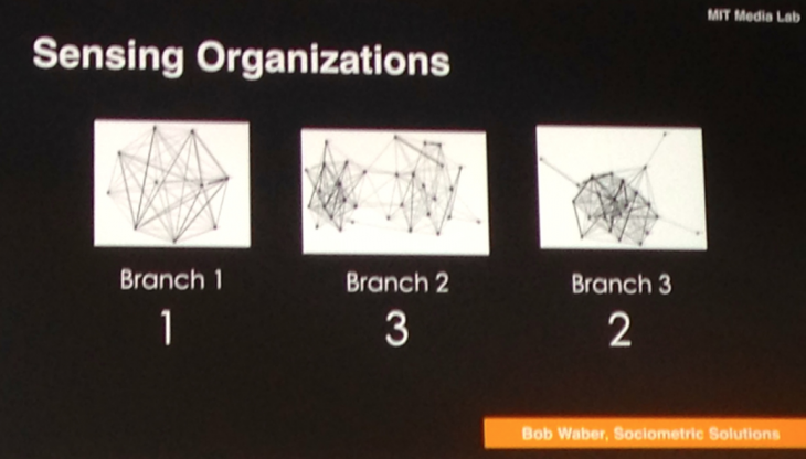Lippman’ın örnek verdiği projeleri eski MIT öğrencilerinin şimdiki şirketlerinden seçtiğini de belirteyim. bu örneklerden bir tanesi, Çek Cumhuriyeti’nde bir bankanın 3 farklı şubesinde insan hareketlerini analiz ederek sosyal bir grafik oluşturuyor. Aşağıda görselleştirilmiş veriye bakarak şubeler hakkında yorum yapmanın ne kadar kolay olduğunu görebilirsiniz: 1 no’lu şube sosyal iletişimin de en yüksek olduğu şube, herkesin birbiriyle iletişimi (insan ağı) sağlıklı. 2 no’lu şubede kesin bir gruplama görüyoruz, bunun nedeni şubenin 2 katlı olması, bu da insanların bağlantılarında kesin bir ayrıma yol açıyor. 3 no’lu şubedeyse sıkı bir ağ var, ancak bu ağın dışında 3 kişi görünüyor, bunlar şubede yeni çalışmaya başlayan elemanlar.