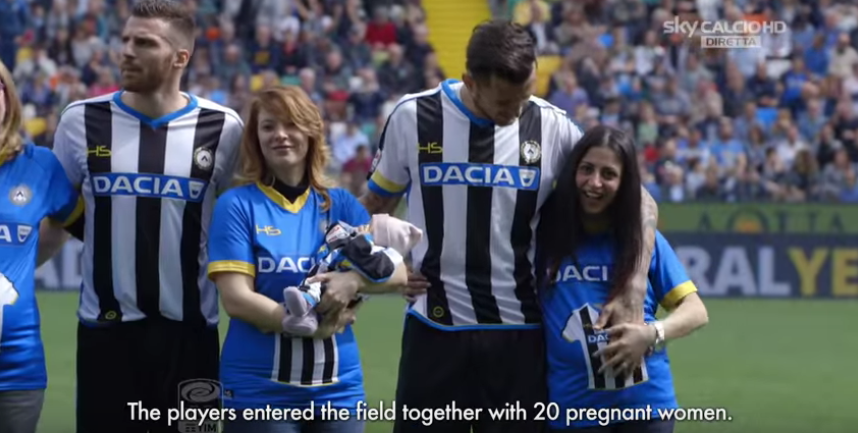 3 ay sonra bebeklerini kucaklayacak olan 20 anne, Udinese – Napoli maçından yeşil sahaya takımların oyuncularıyla birlikte çıktı. Karşılaşmanın olduğu gün, toplam 148 anne adayı, geleceğin futbol taraftarlarıyla birlikte stadyumdaki yerini aldı. Bebeklerden 2’si ise doğmuştu ve annelerinin kolları arasında ilk maçlarını seyretti.