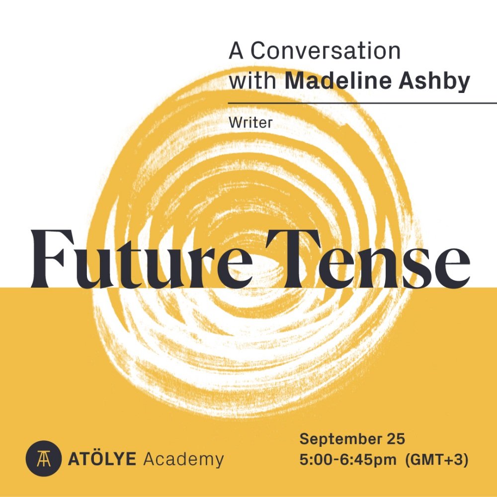 ATÖLYE Akademi Future Tense (Gelecek Zaman) serisinde dünyanın farklı noktalarından konuklarıyla uzun süreli düşünce şekillerini izleyici kitlesi ile birlikte ele alıyor. Daha önceleri Future Tense etkinliklerinde Andrés Colmenares, Noah Raford ve Dan Hill ile konuşmalar gerçekleştirilmişti. Serinin dördüncü etkinliğinde Torontolu gelecek bilimci ve bilim-kurgu yazarı Madeline Ashby konuk olarak yer alacak.