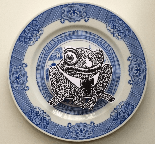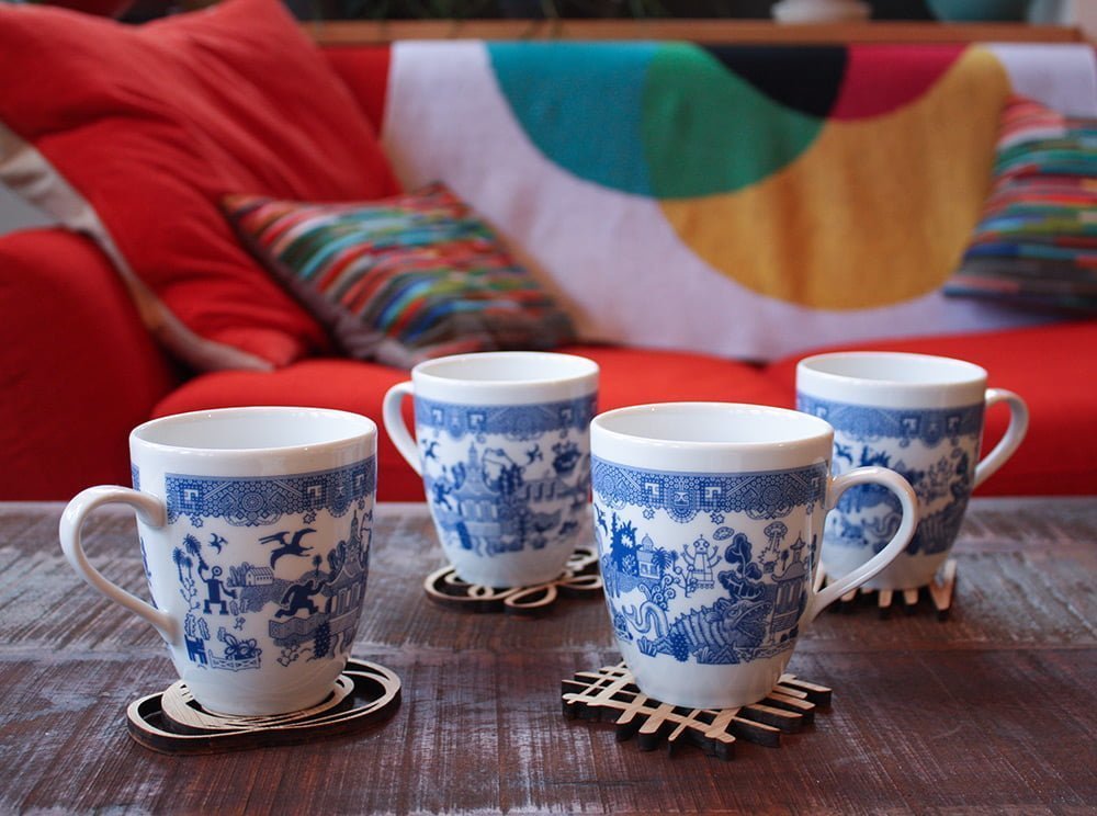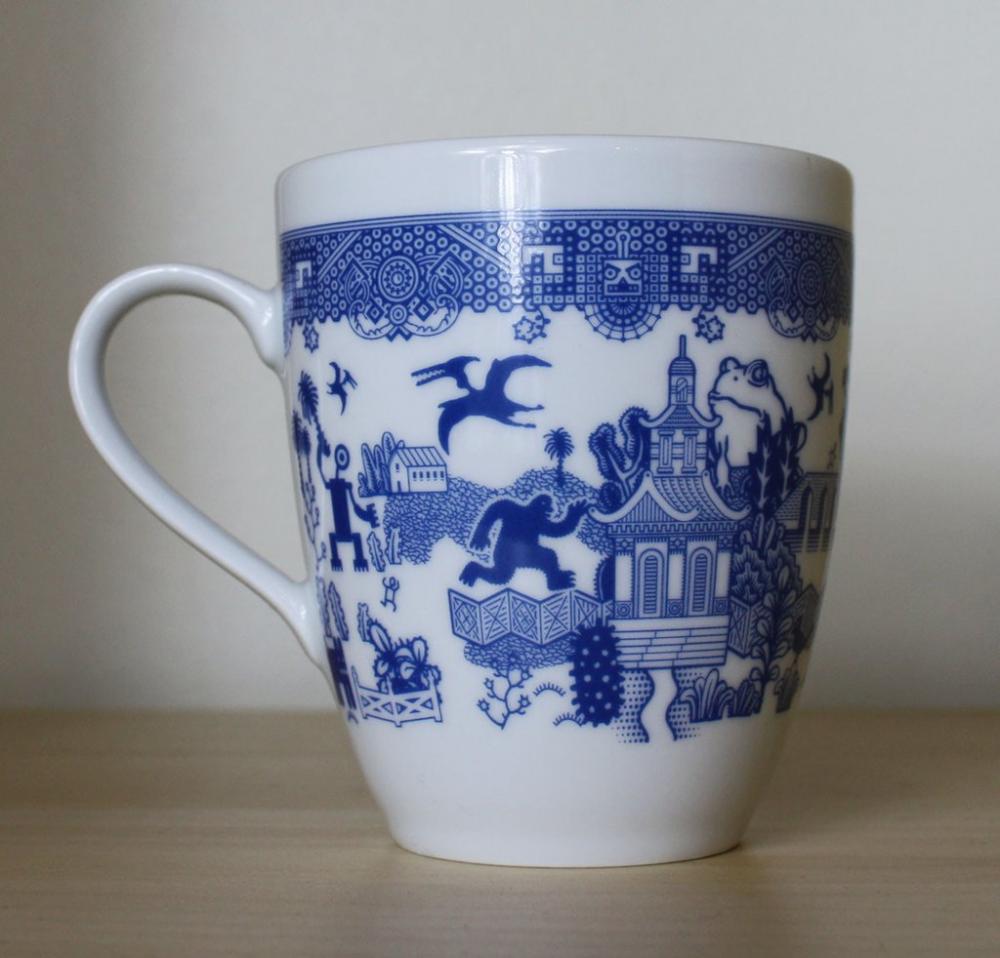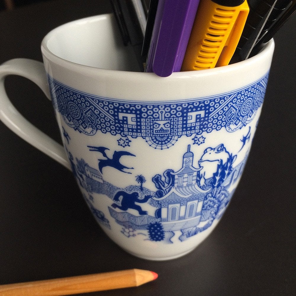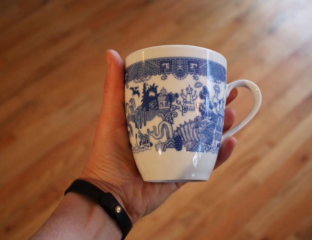 Moyer’ın kupaları ilk bakışta, geleneksel Çin porselenlerinden dünyaya yayılmış olan ve hepimizin gözünün aşina olduğu Blue Willow (mavi söğüt) desenleriyle süslenmiş gibi görünüyor. Ancak biraz yakından bakıldığında kızgın suratlı robotların, UFO’ların, dev kurbağaların ve kızgın Tepegöz’lerin rol aldığı illüstrasyonlardan oluştuğunu görüyoruz. Bu beklenmedik desenler, konularına rağmen insanın yüzünde ister istemez gülümseme uyandırıyor. Bu desenlerle süslenmiş bir Türk kahvesi fincanı da çok hoş olabilirdi.