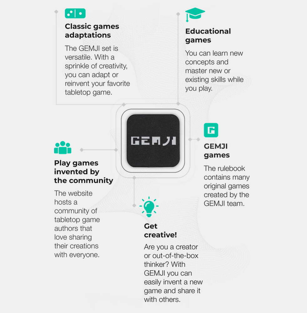 Yaratıcı gücünüzü dinlendirirken GEMJI ile satranç, tavla, go, dama ve Jenga gibi klasik oyunları oynayabilirsiniz. GEMJI’nin bu çok işlevliliği, özellikle seyahatler için oldukça avantajlı. Parçaların manyetik olması, hareket halindeki bir aracın içinde oynanabilmesine imkan tanıyor ve kaybolma riskini de azaltıyor. Her bir sette 70 adet siyah-beyaz kart/karo bulunuyor. Gelecekteki güncellemelerle daha birçok oyunun oynanmasına imkan verecek kendi mobil uygulamasına da sahip.